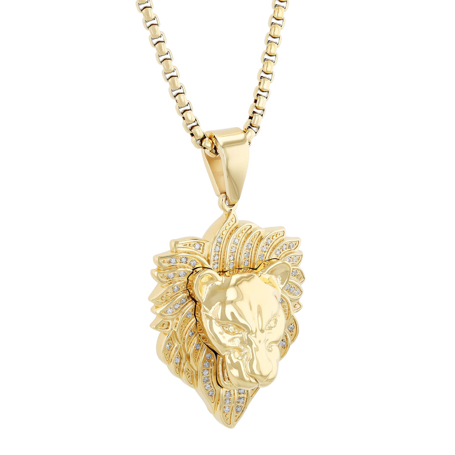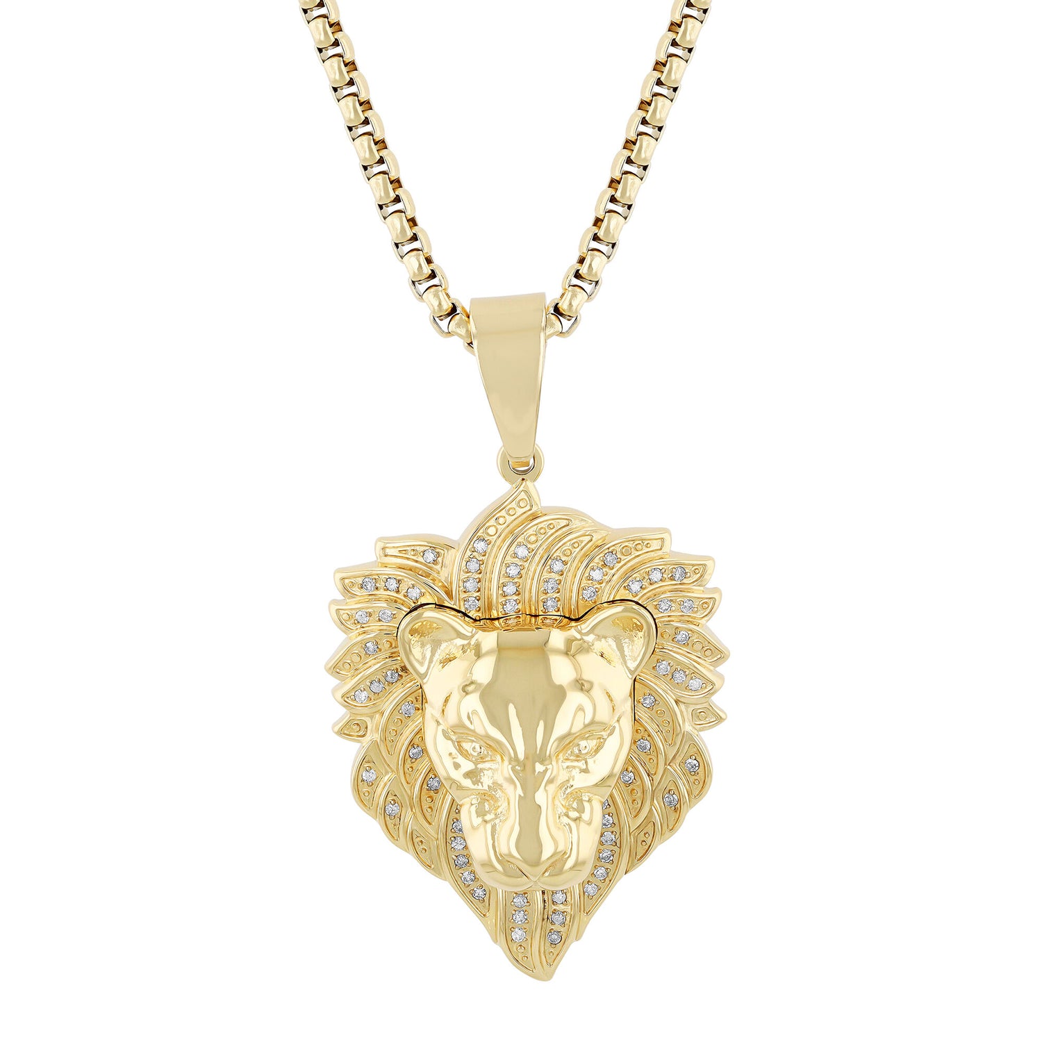 This Diamond Lion Head Pendant by Helzberg fuses fierce style with bold luxury. Crafted from yellow gold-tone ion-plated stainless steel, the pendant features 61 sparkling single-cut diamonds that cascade down the lion’s mane, creating a powerful and scintillating statement piece. Perfect for those who embrace strength and confidence with a touch of glamour.