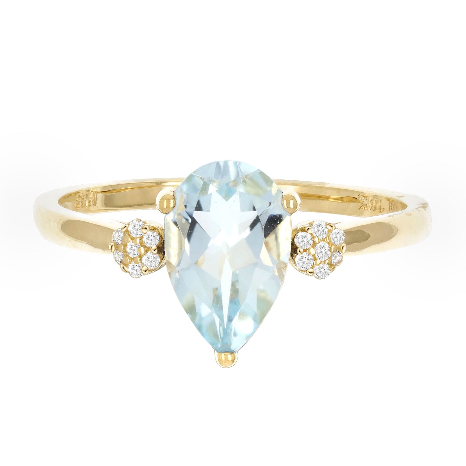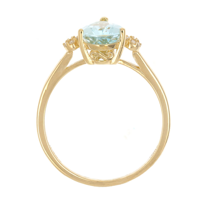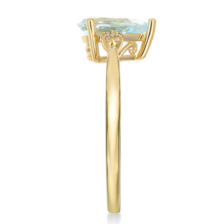 Handcrafted in 10K yellow gold. One pear-shaped lab-created aquamarine with fourteen round single cut diamond accents. Ring dimensions unspecified. Polished finish.