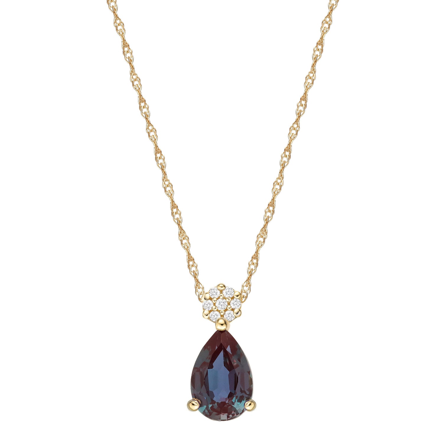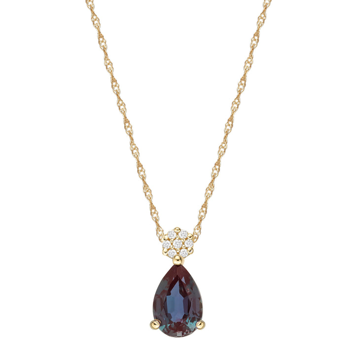 Handcrafted in 10K yellow gold. One pear-shaped lab-created alexandrite with seven round single cut diamond accents. Pendant dimensions unspecified. Secure bail.