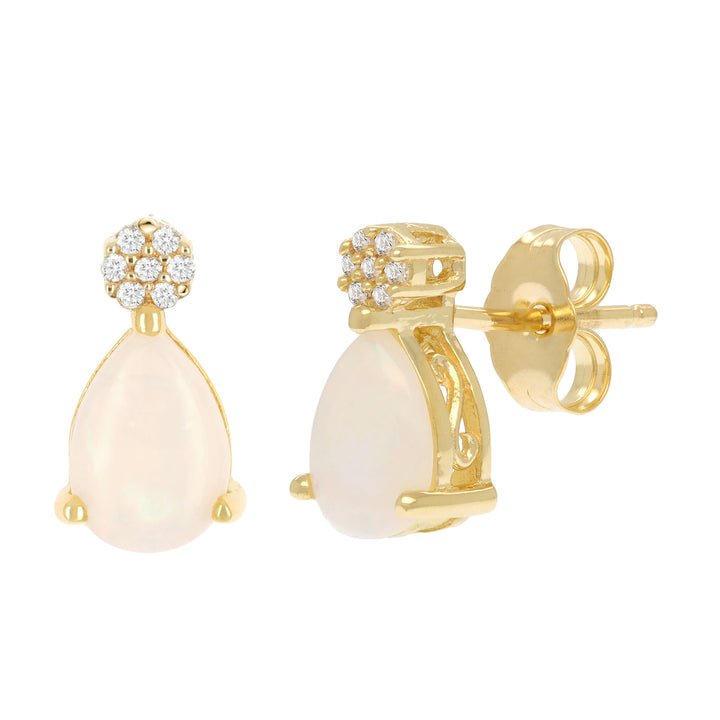 Handcrafted in 10K yellow gold. Pear-shaped opal center stones with seven round single cut diamond accents per earring. Stud style with secure posts.