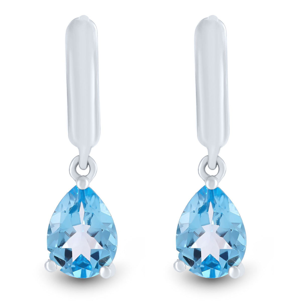 Handcrafted in sterling silver. Pear-shaped blue topaz gemstones. Dangle hoop design. Size unspecified. Secure closures.