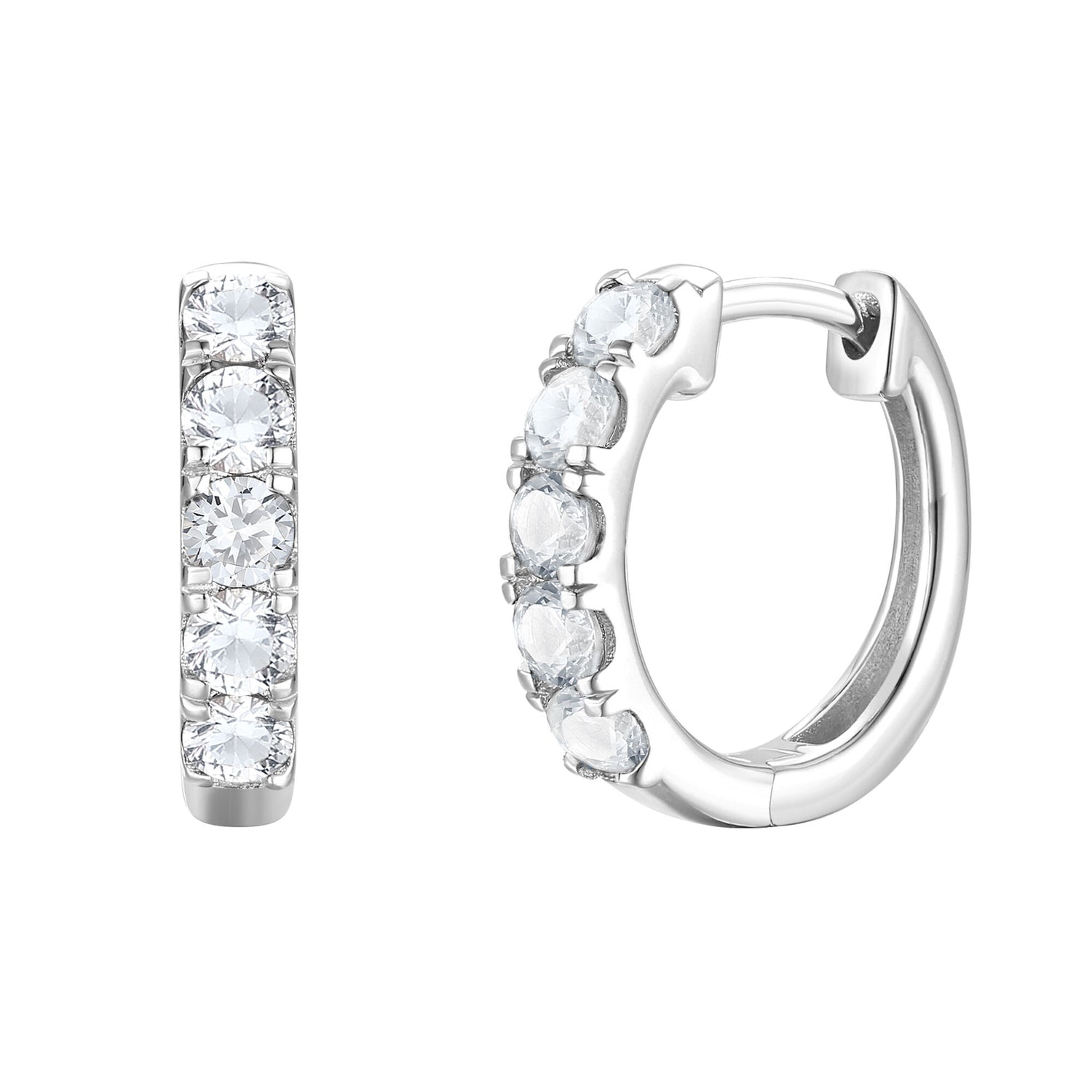 Handcrafted in 10K white gold. Five 2.2MM round white sapphire gemstones per earring. Hoop diameter unspecified. Secure clasp closure.