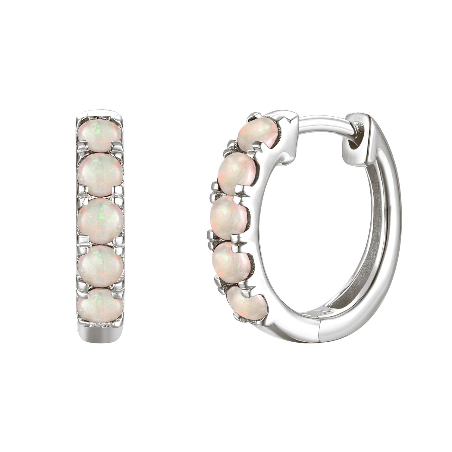 Handcrafted in 10K white gold. Five 2.2MM round opal gemstones per earring. Hoop diameter unspecified. Secure clasp closure.