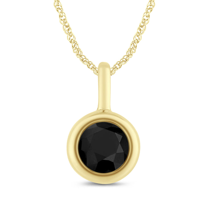 Handcrafted in 10K yellow gold. Center stone: one round brilliant cut black diamond, total 1 carat. Bezel setting. Pendant dimensions unspecified.