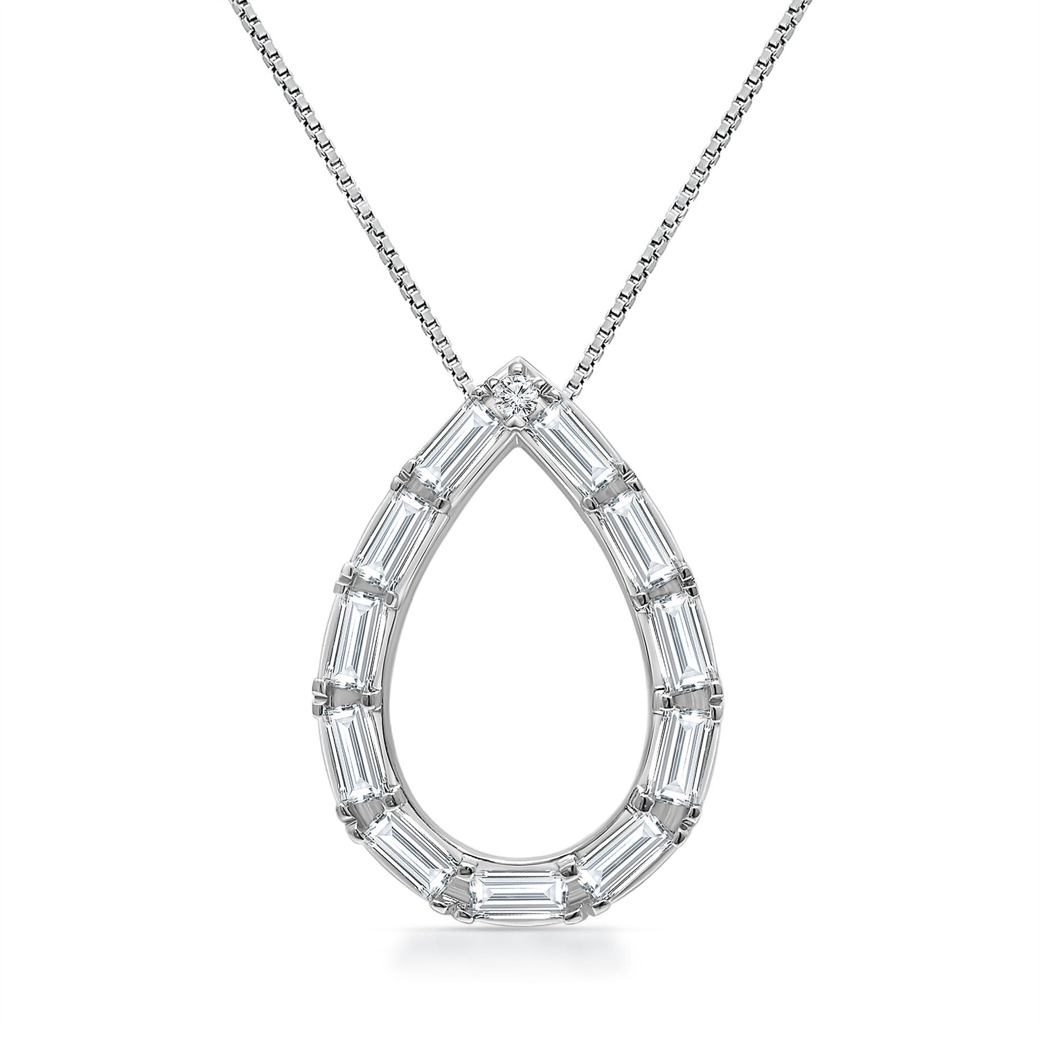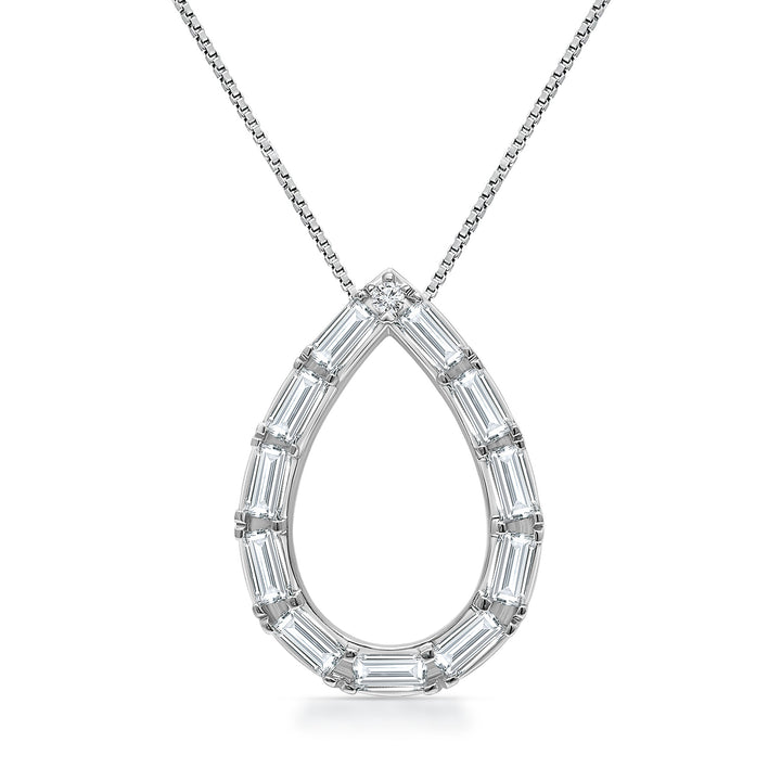 This Lab Grown Diamond Pear-Shaped Pendant by Helzberg offers timeless elegance with a modern ethical twist. Set in polished 10K white gold, it features one round brilliant cut lab-grown diamond complemented by 11 baguette lab-grown diamonds in a graceful pear-shaped design. Perfect for those seeking sustainable luxury with radiant sparkle that elevates any neckline.