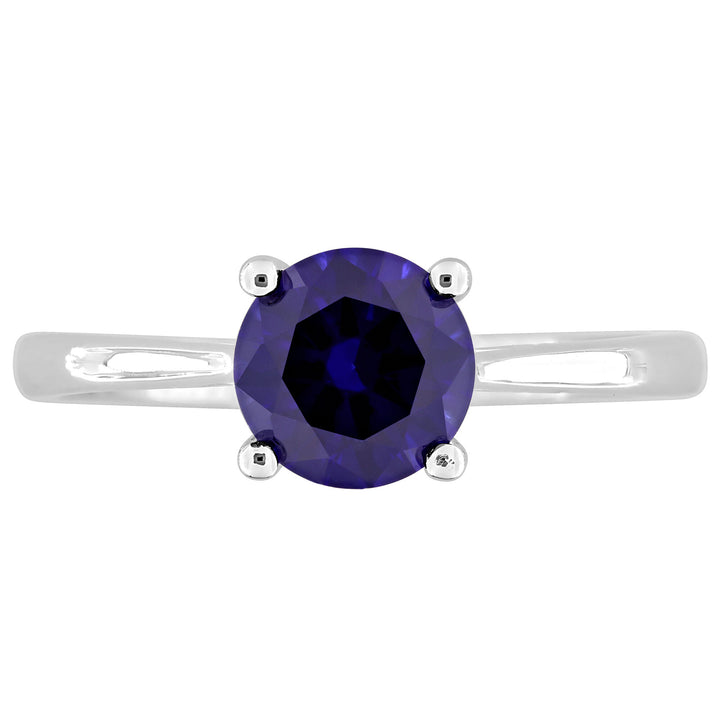 Made in sterling silver with one round lab-created blue sapphire measuring 7 millimeters. Polished band with standard sizing.