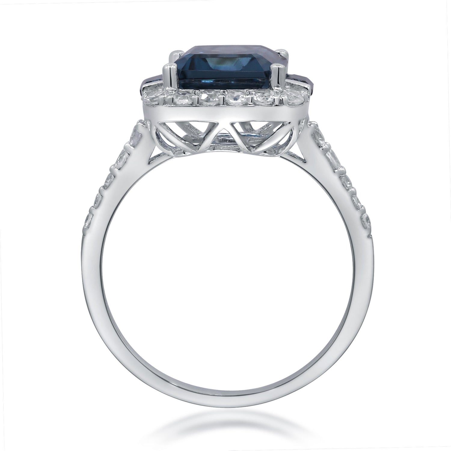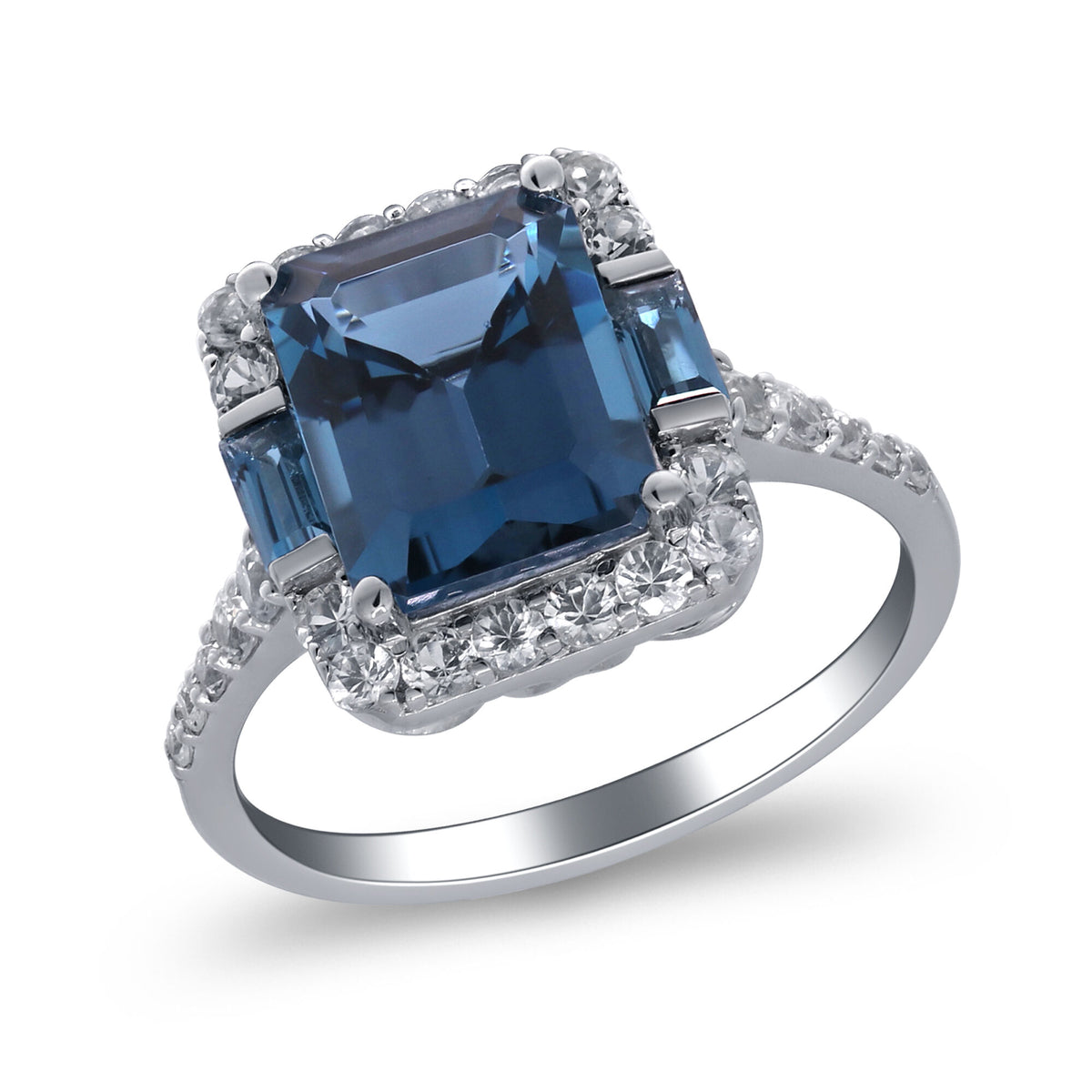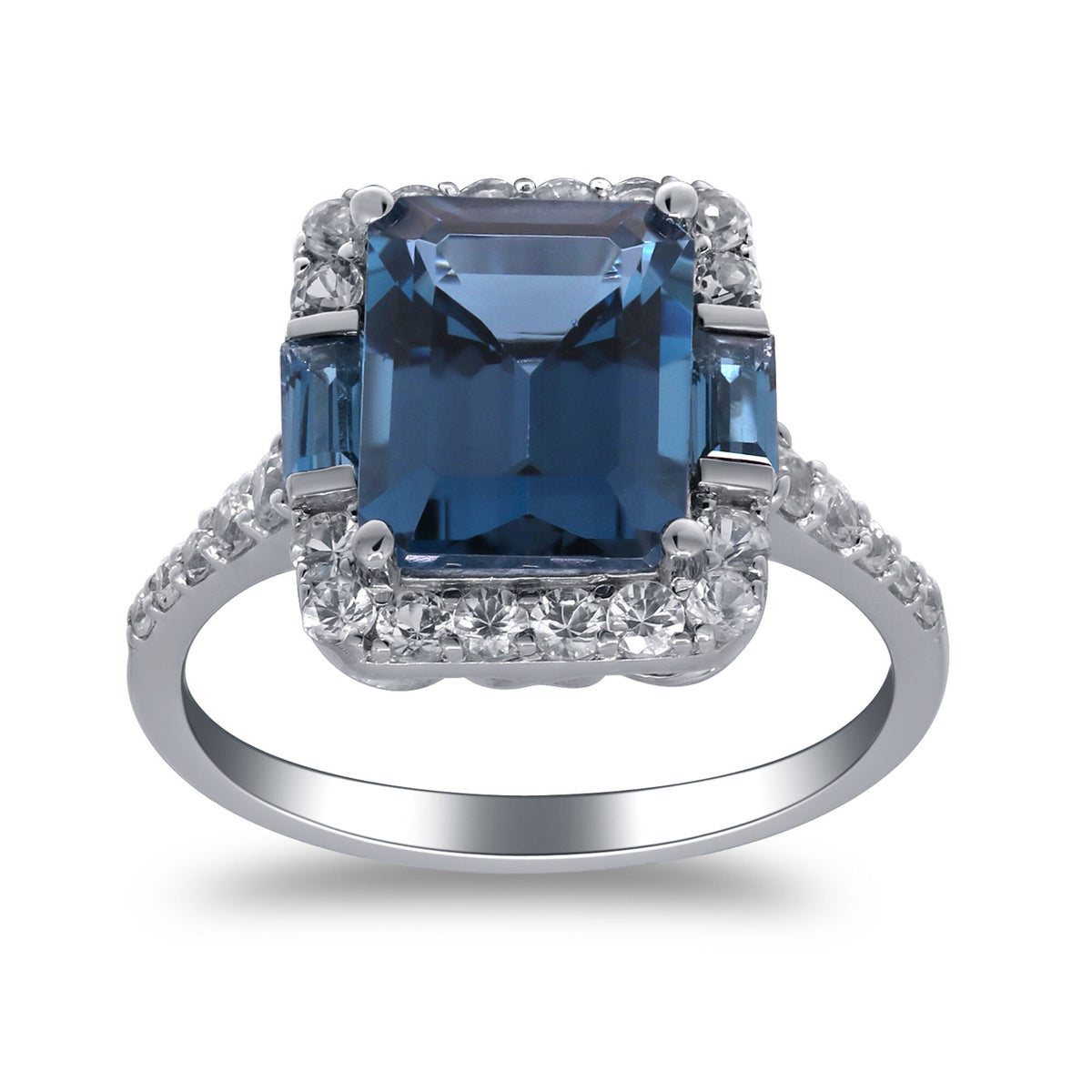 Crafted in polished sterling silver featuring one emerald-cut London blue topaz, two baguette London blue topaz gemstones, and 26 round white sapphires. Ring size not specified.