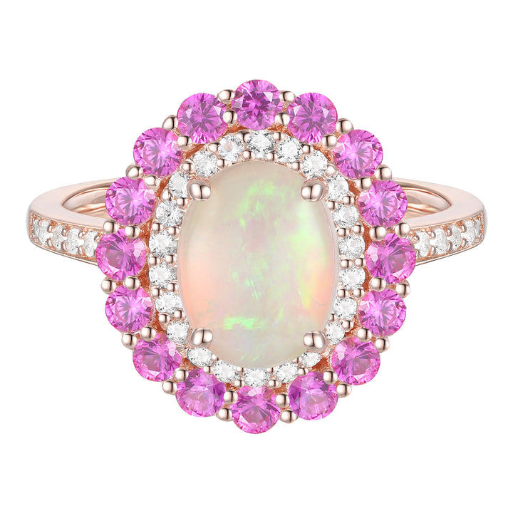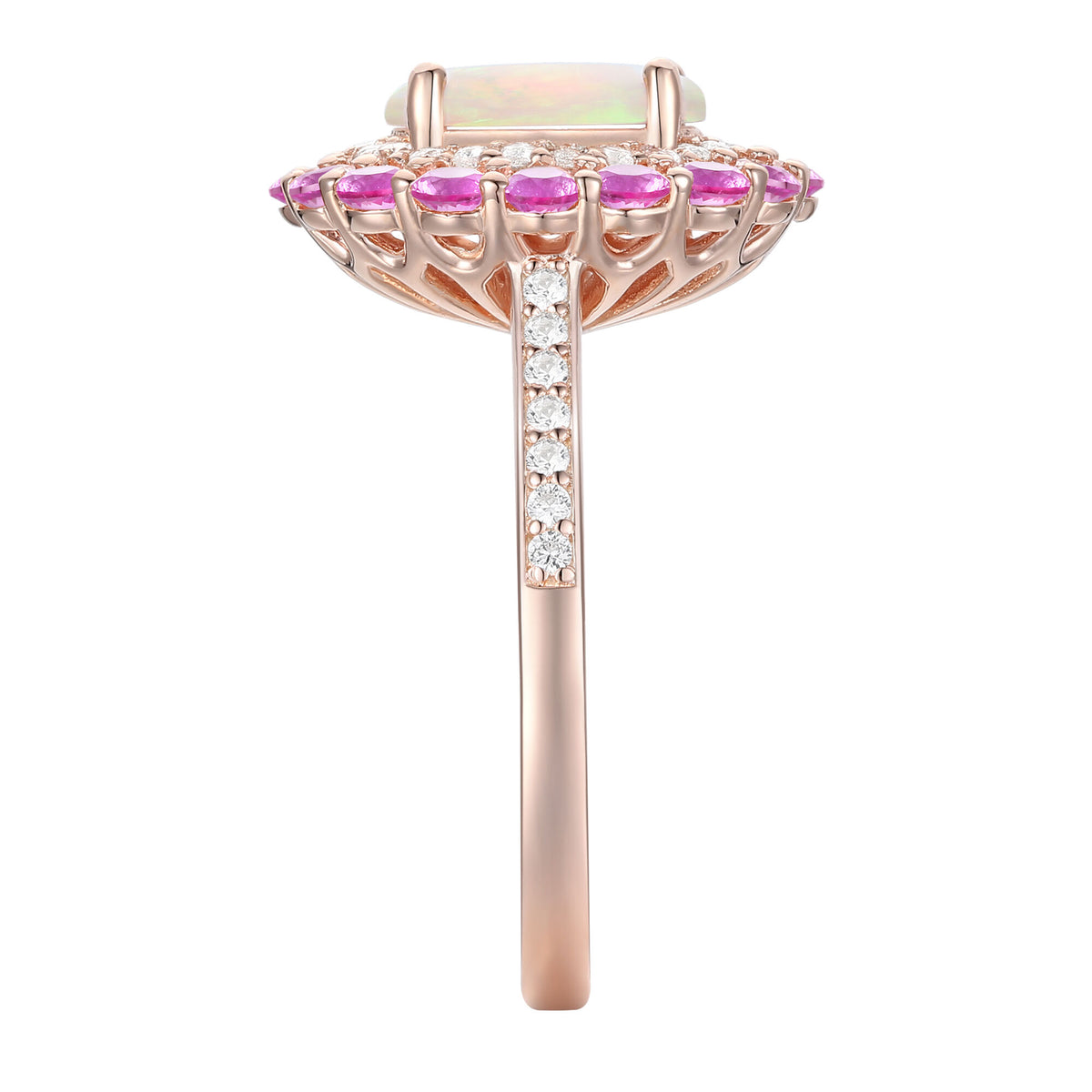 Handcrafted in 10K rose gold with one oval opal, 16 round pink sapphires, and 36 round single-cut diamonds totaling approximately 0.25 carat, polished finish, size options available.