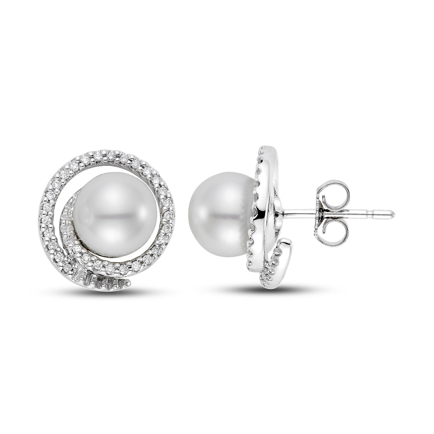 Crafted in 18K white gold, featuring one 7.5–8 mm round white freshwater pearl per earring and 30 round brilliant cut diamonds. Earring type: stud with post and friction back closure.