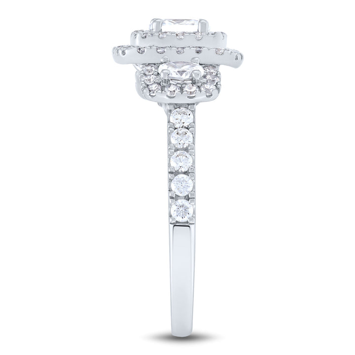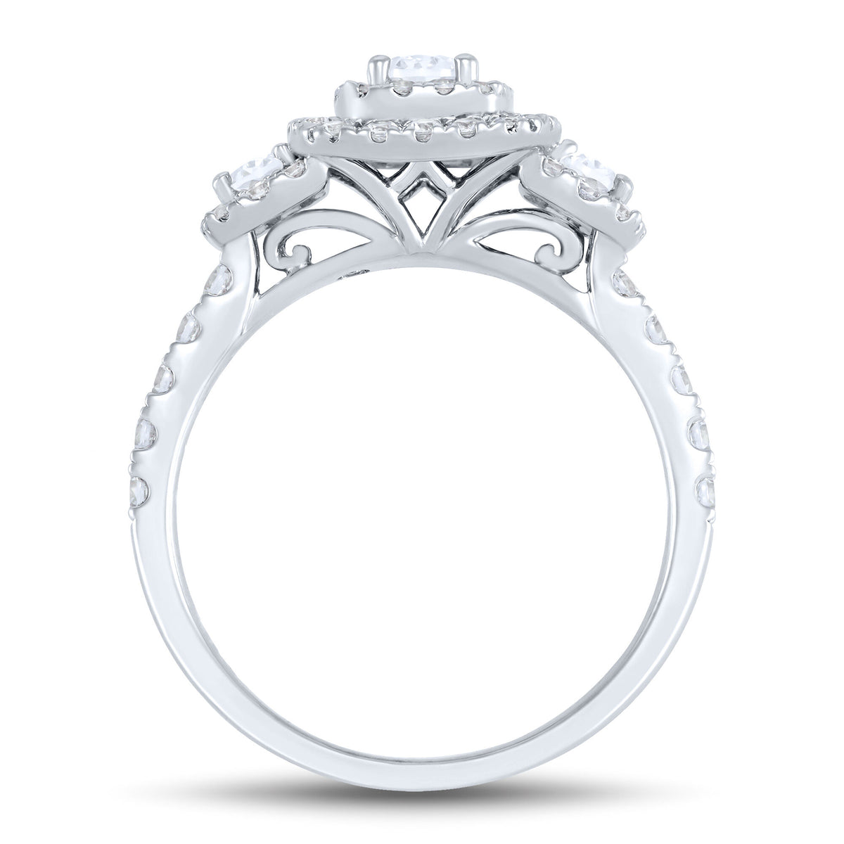 This Three-Stone Diamond Ring by Helzberg sparkles with refined sophistication. Set in 14K white gold, it features a 1/3-carat oval brilliant cut center diamond flanked by two oval brilliant cut side diamonds, enhanced by 62 additional diamonds arranged in a halo and along the gallery for radiant brilliance.