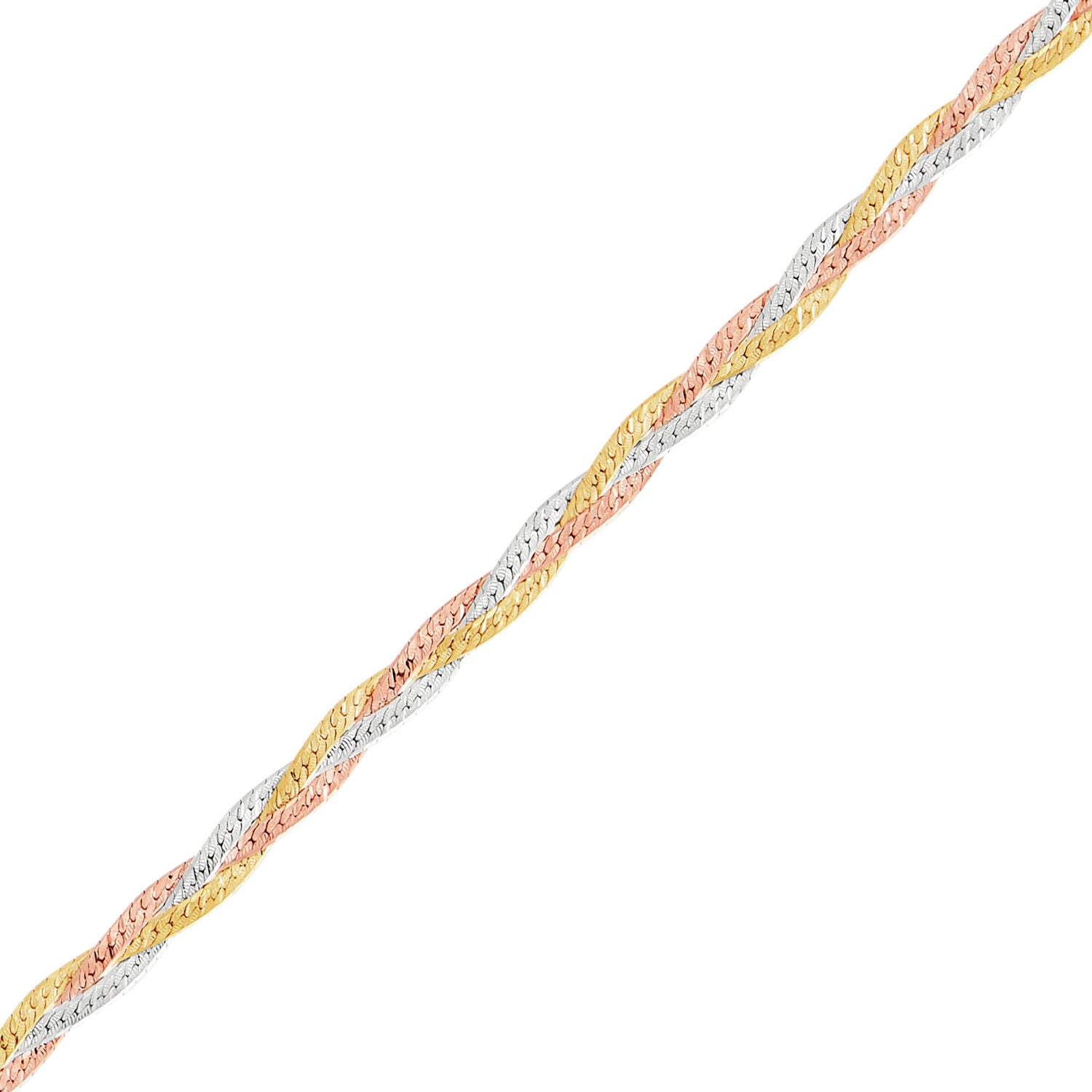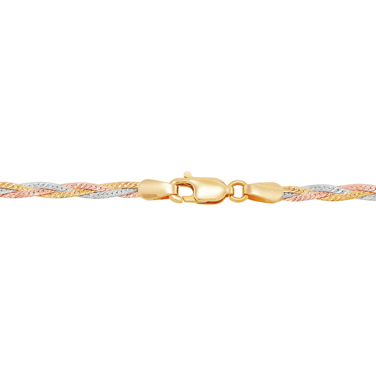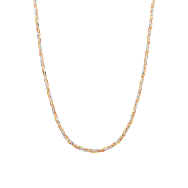 This Herringbone Chain by Helzberg offers sleek elegance in 10K yellow, white, and rose gold. Measuring 18 inches, its classic pattern and tri-color design add a sophisticated shimmer, perfect for layering or standalone wear.