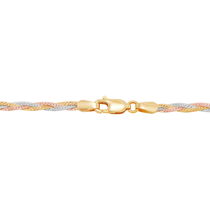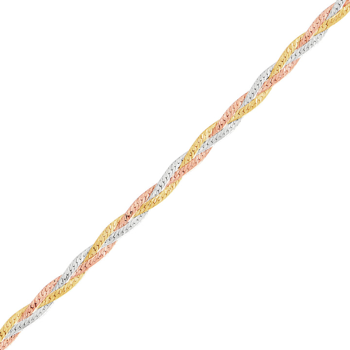 Crafted in 10K yellow, white, and rose gold. Measures 18 inches. Polished herringbone chain with secure clasp.