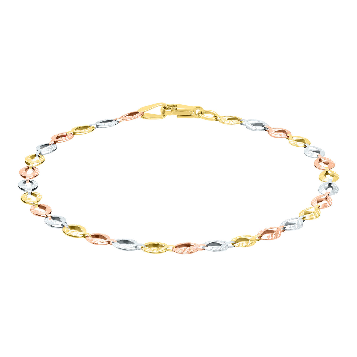 Crafted in 14K yellow, white, and rose gold. Measures 7.5 inches in length. Polished diamond-cut oval link design with secure clasp.