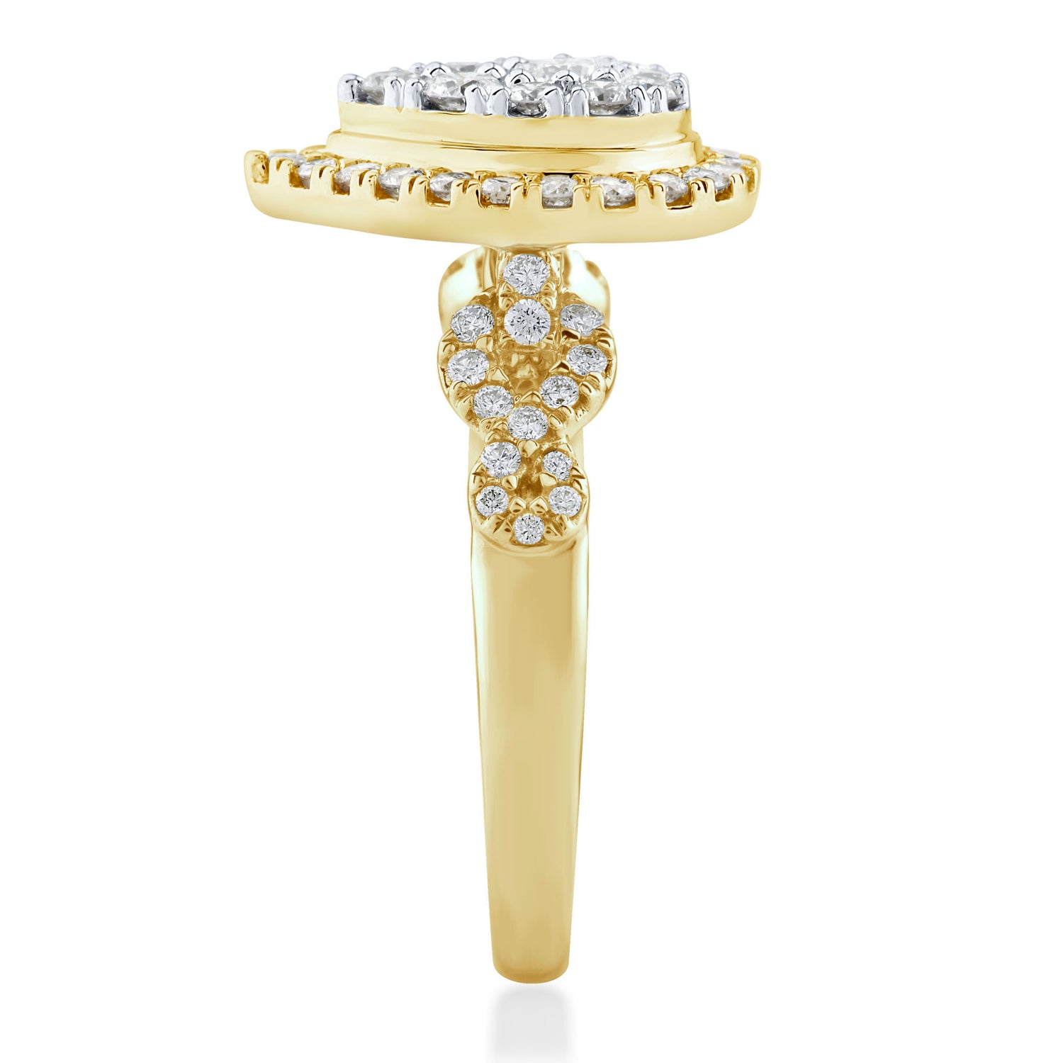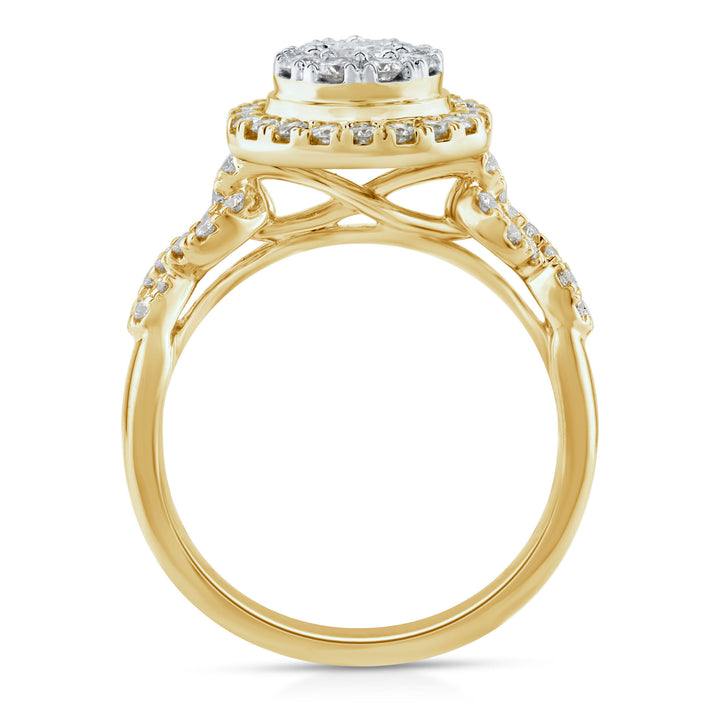 This Composite Diamond Engagement Ring by Helzberg captivates with vintage-inspired elegance. Ten round brilliant cut center diamonds are enhanced by 50 round brilliant cut diamonds arranged in a shimmering halo and gallery, all set in classic 14K yellow gold for a dazzling statement.