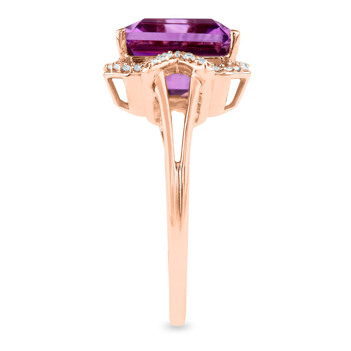 Crafted in 10K rose gold, featuring one emerald-cut amethyst and 50 round single cut diamonds with a total carat weight of approximately 1/8 carat. Polished band with traditional sizing.