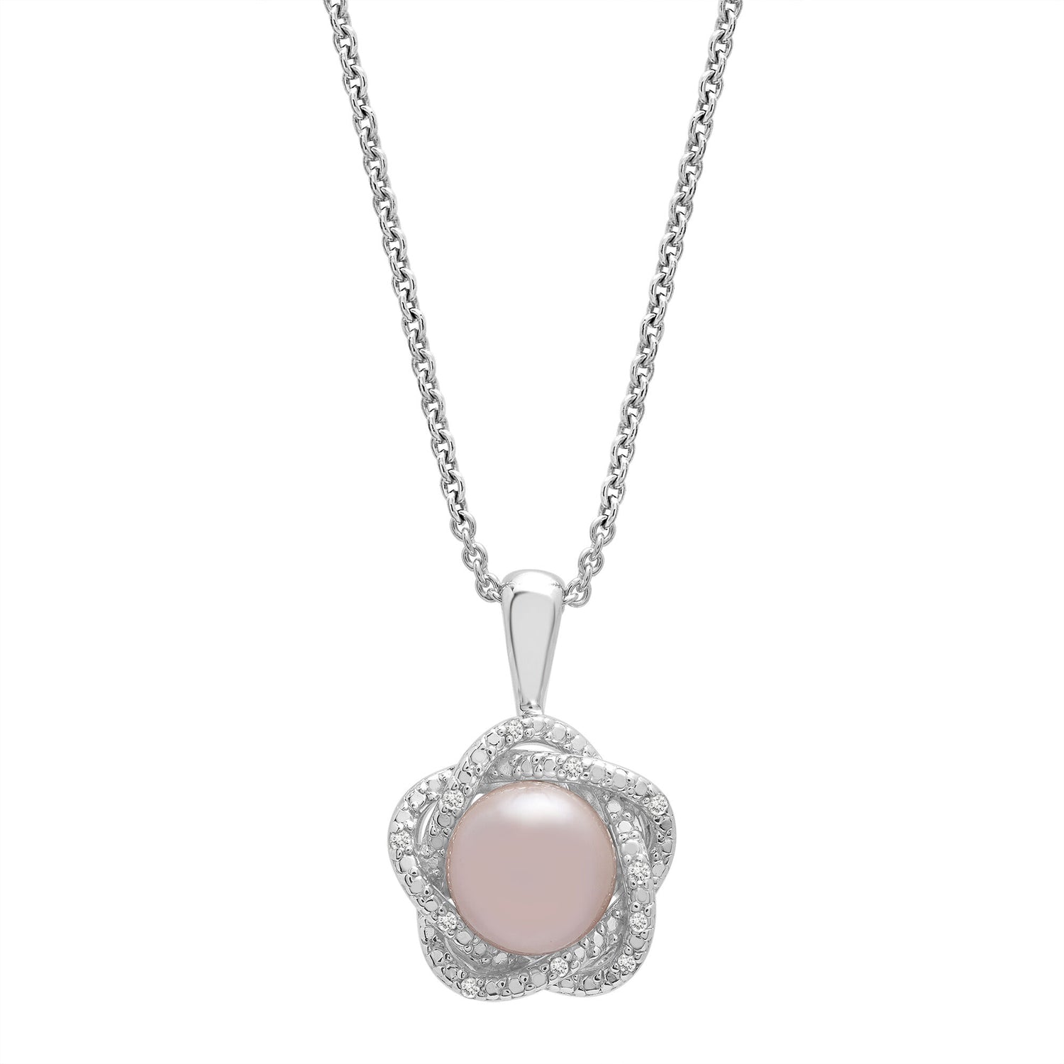 Crafted in sterling silver featuring one round pink freshwater cultured pearl and ten round single cut diamonds. Includes an 18-inch cable chain.