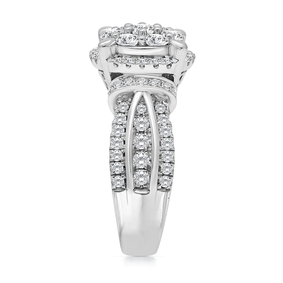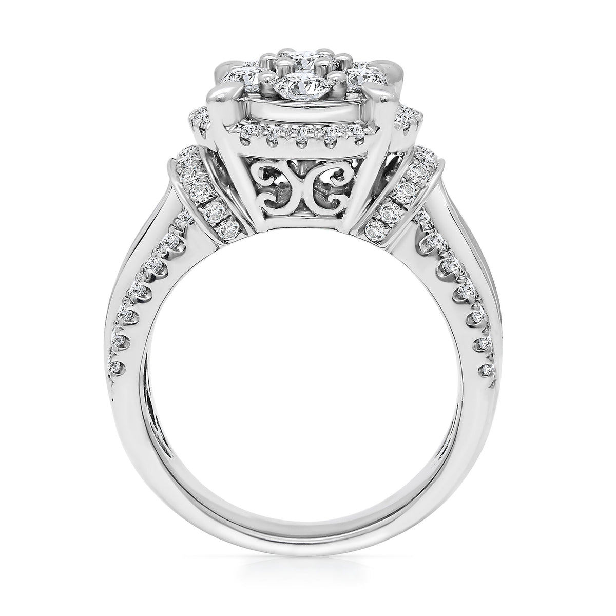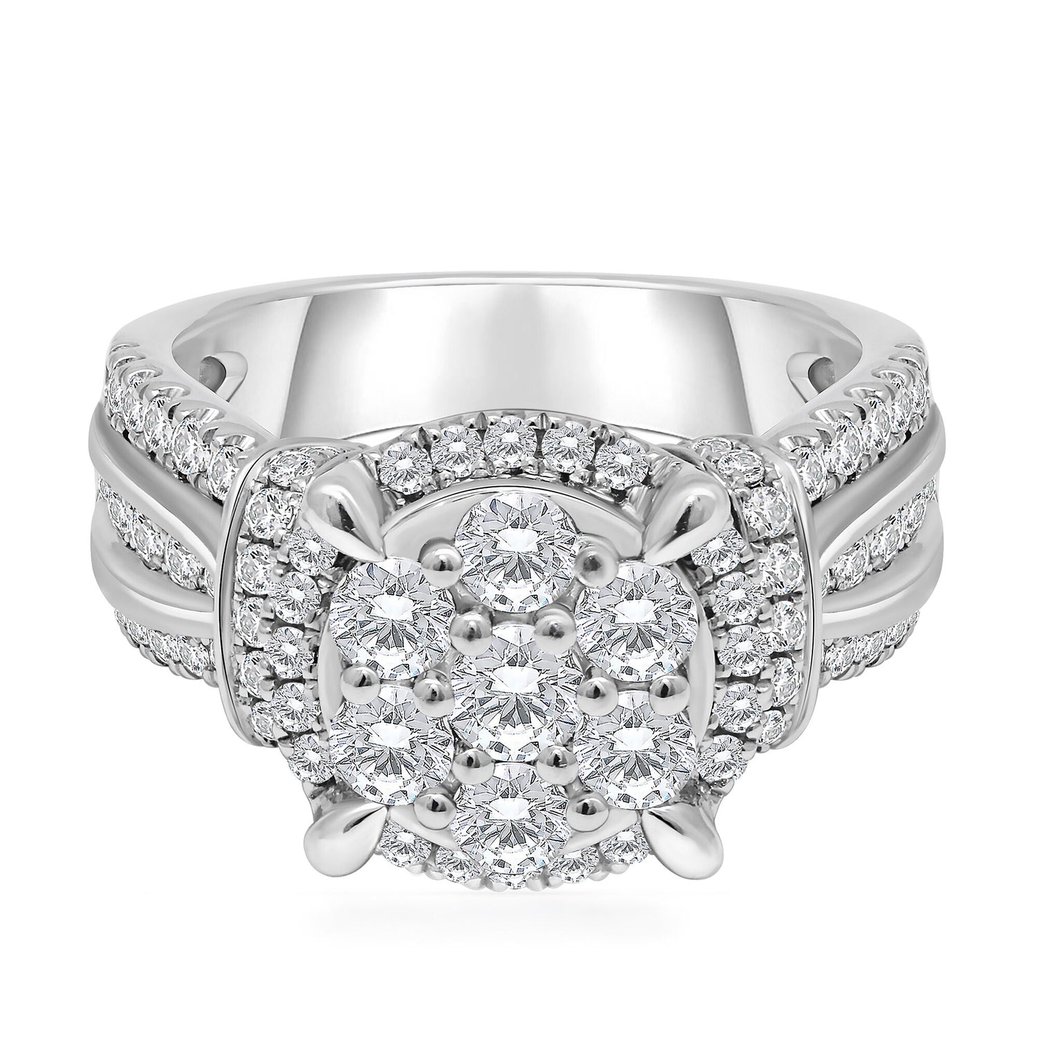 Made in 10K white gold with nine princess cut diamonds in the center cluster and 98 round brilliant cut diamonds totaling approximately 2 carat tw. Standard ring sizing.