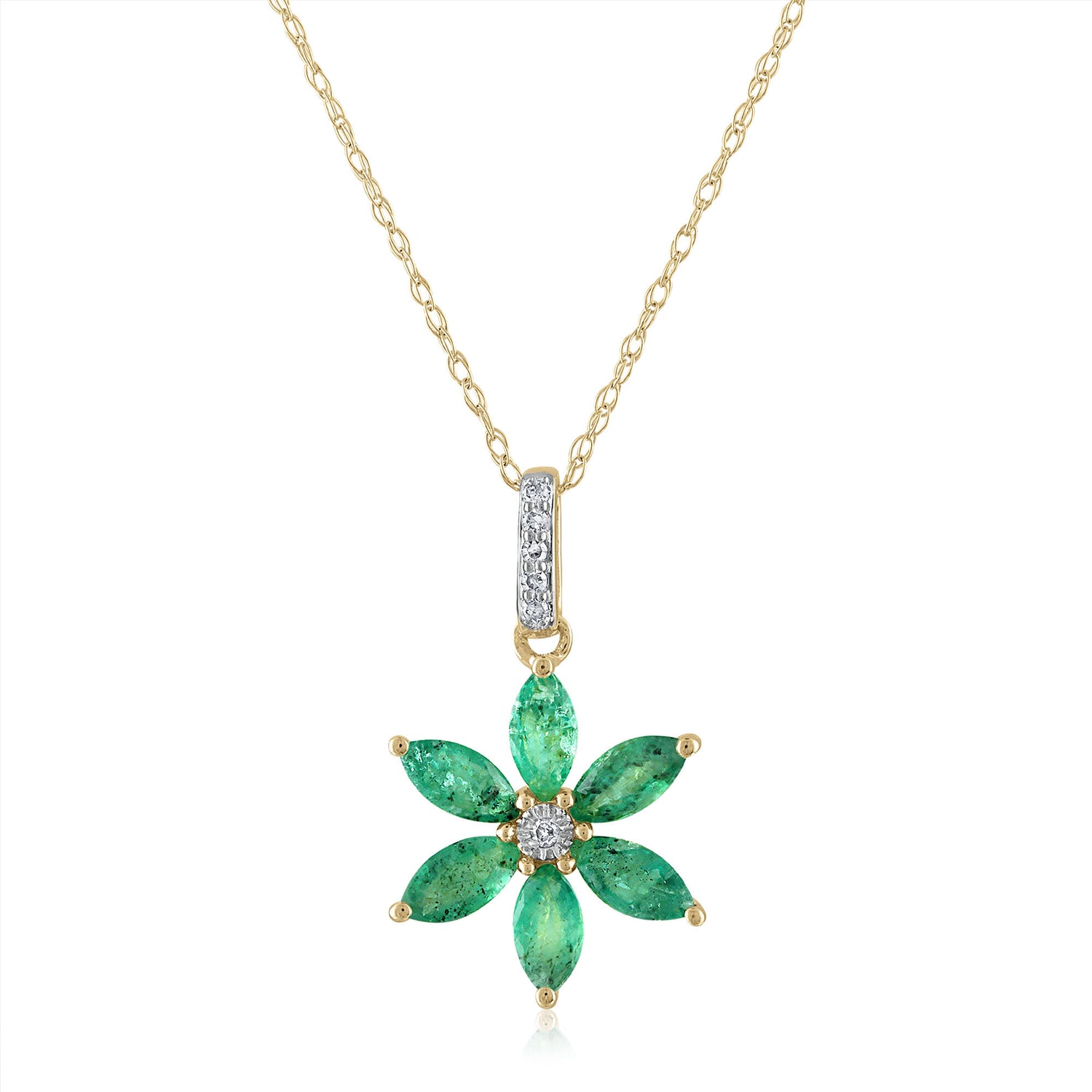 This Emerald Flower Pendant with Diamond Accent by Helzberg adds a delicate pop of color and charm to any ensemble. Crafted in 14K yellow gold, it features six marquise brilliant cut emeralds arranged as petals, enhanced by six round single cut diamonds for sparkle. The pendant hangs from a matching 18-inch rope chain for effortless elegance.