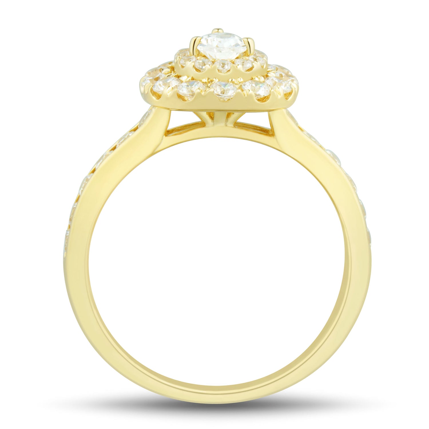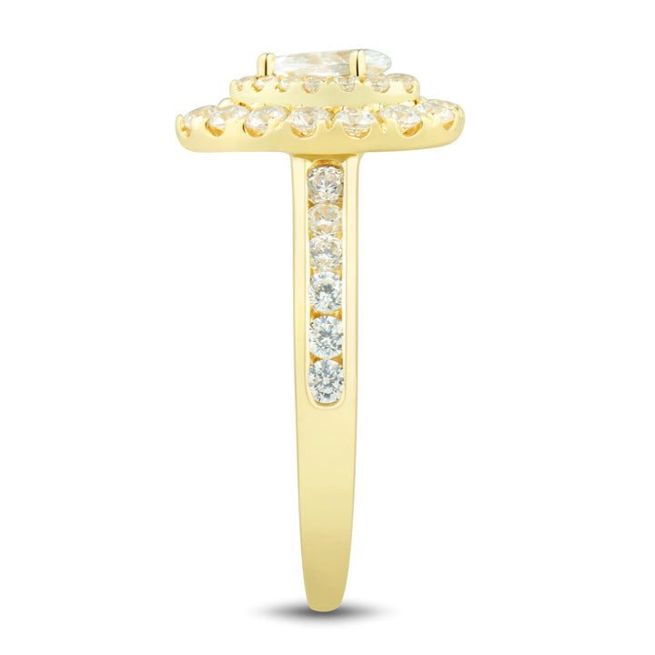 Made in 14K yellow gold with a 1/4 carat pear-shaped brilliant cut center diamond and 40 round brilliant cut diamonds totaling approximately 1 carat tw. Standard sizing.