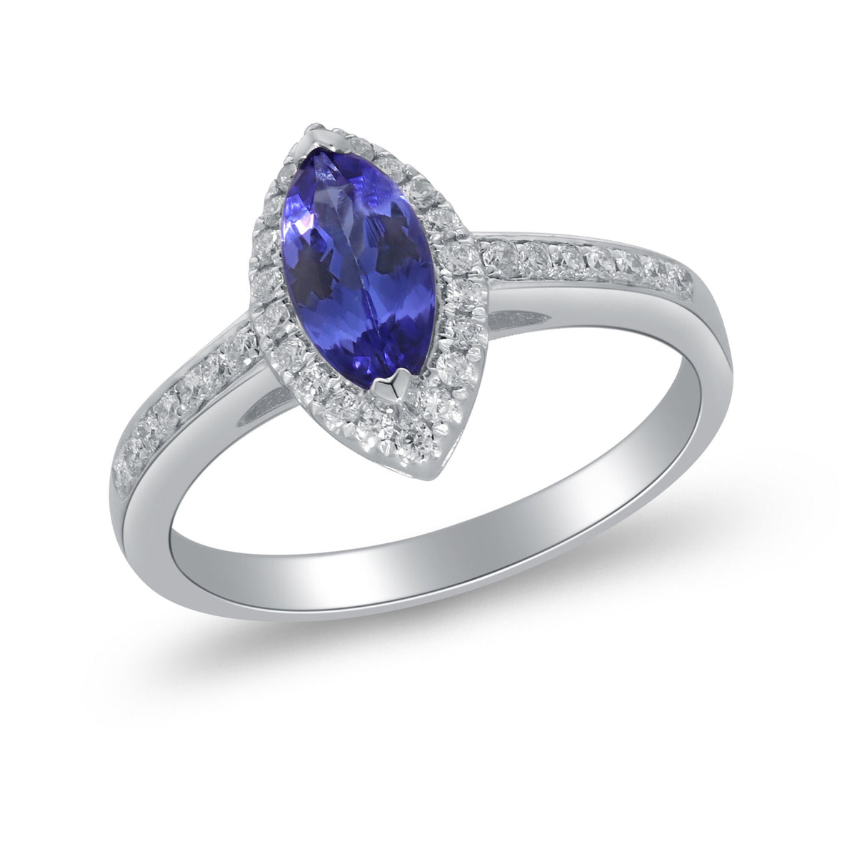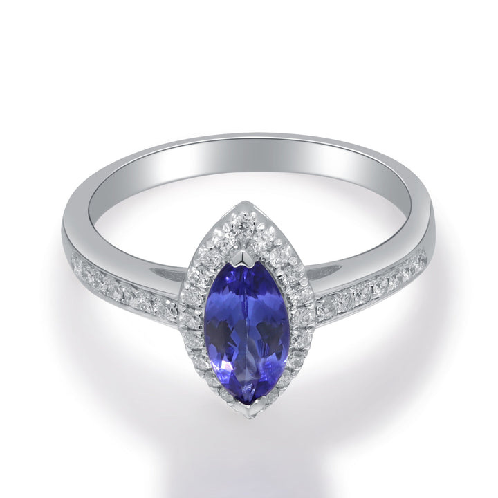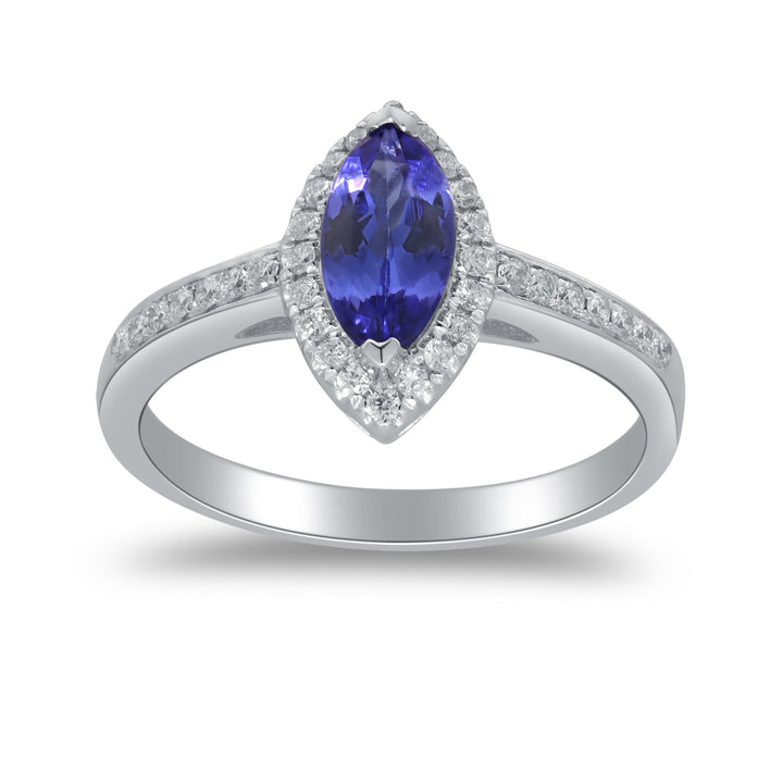 Made in 10K white gold with one marquise tanzanite center stone and 36 round brilliant cut diamonds. Total carat weight approximately 1/7 ct.
