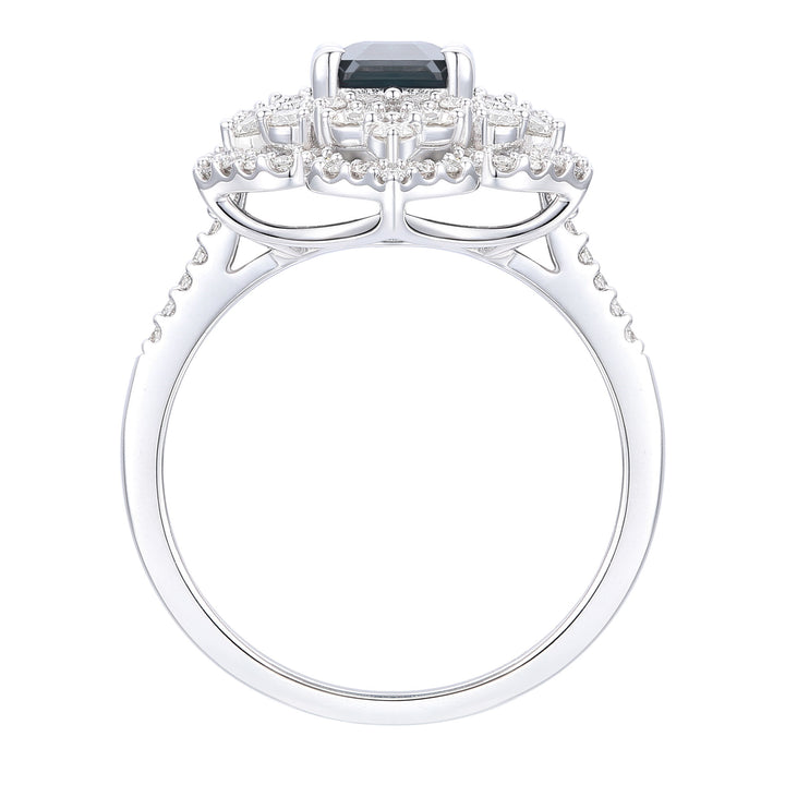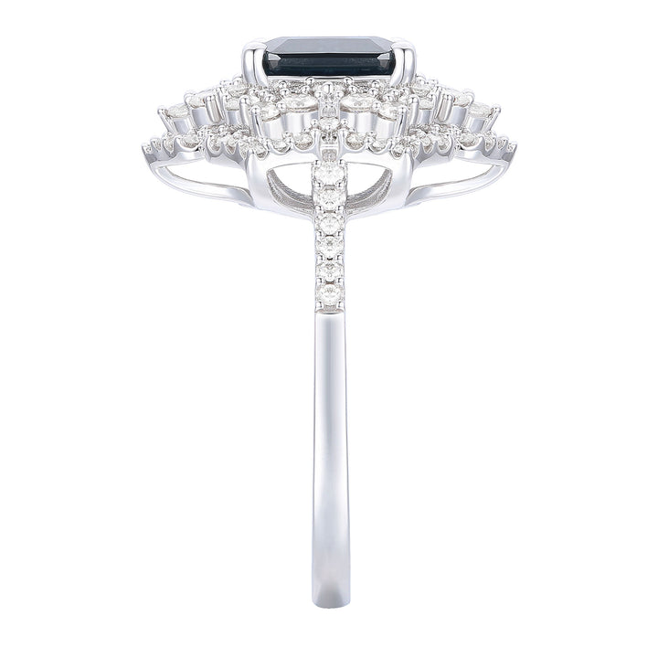 This Blue Sapphire & Diamond Ring by Helzberg radiates vintage charm with a romantic design in 14K white gold. The antique-inspired setting highlights a stunning emerald-cut blue sapphire center surrounded by 96 round brilliant cut diamonds, symbolizing loyalty and eternal beauty. This ring is a breathtaking accessory for those who cherish classic elegance.