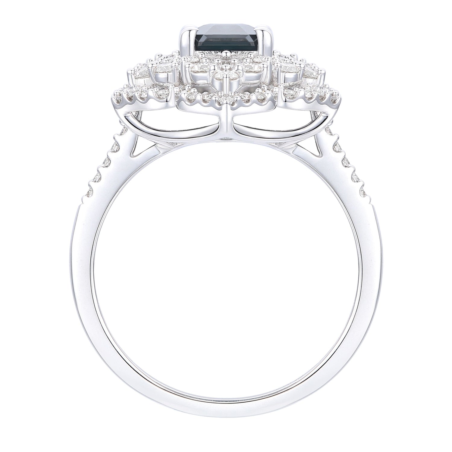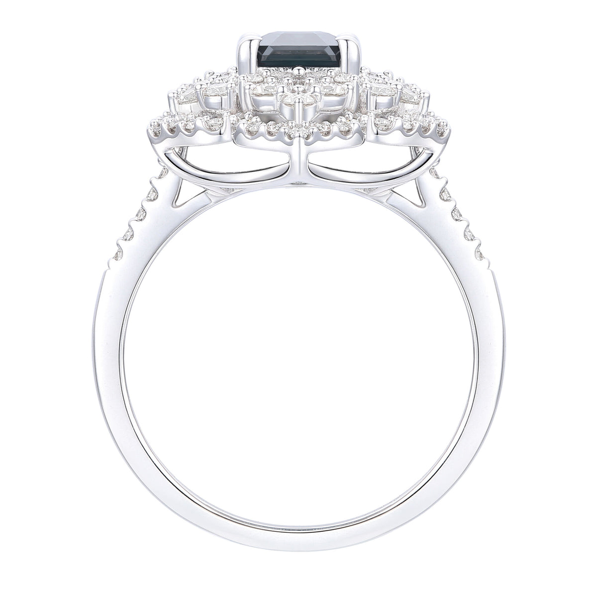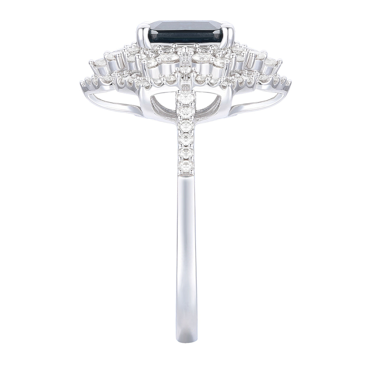 Crafted in 14K white gold with an emerald-cut blue sapphire center stone surrounded by 96 round brilliant cut diamonds totaling approximately 3/4 carat.