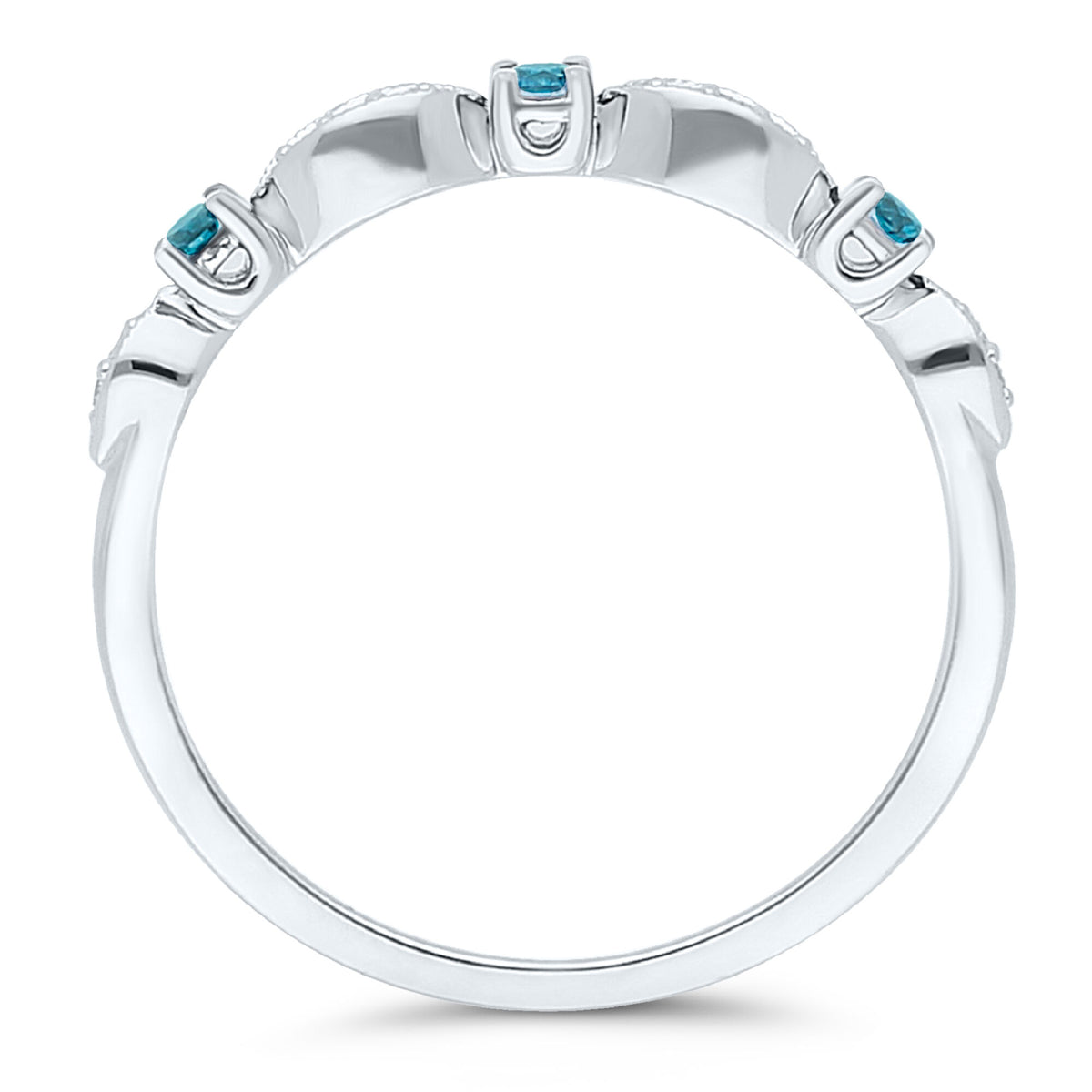 Crafted in 10K white gold. Set with 3 round brilliant cut blue diamonds (approx. 1/10 ct. tw.) and 10 round single cut white diamonds. Band dimensions not specified.