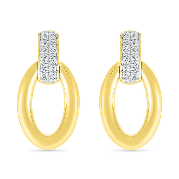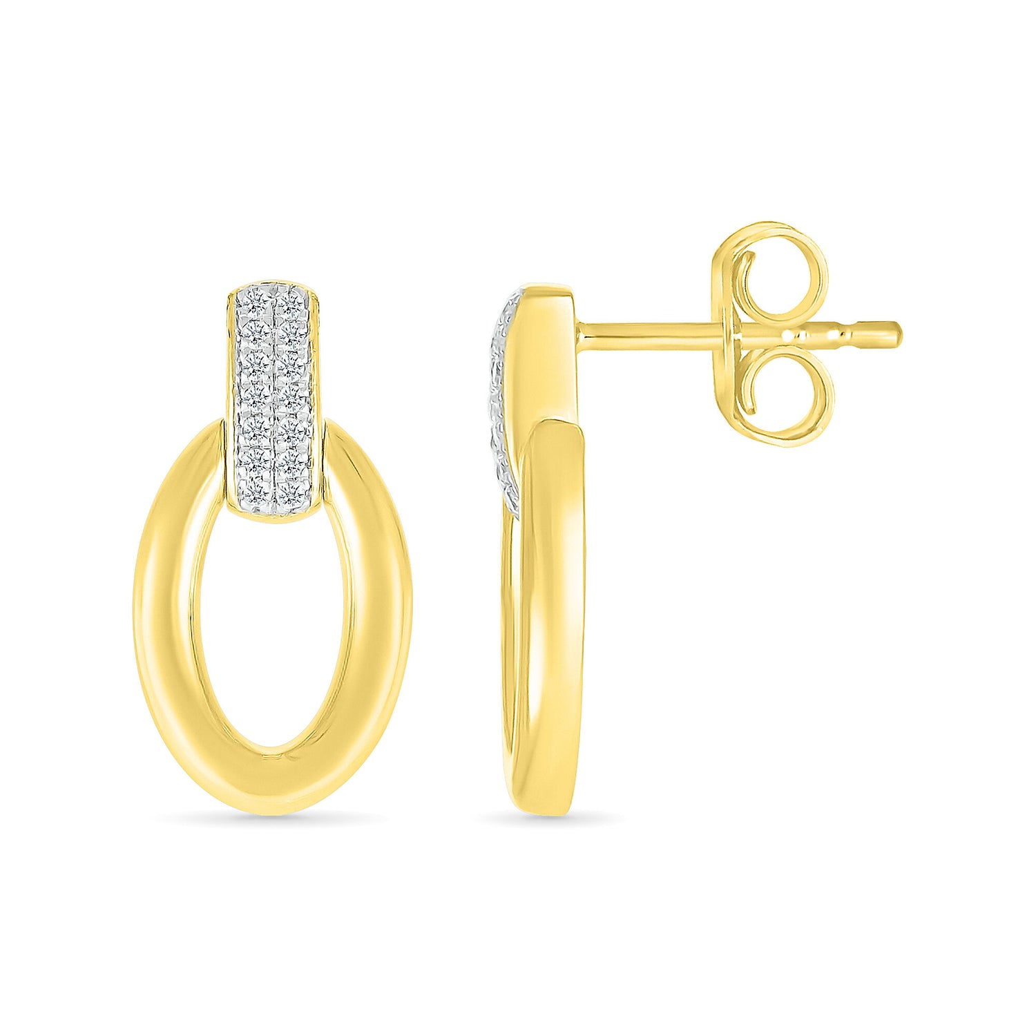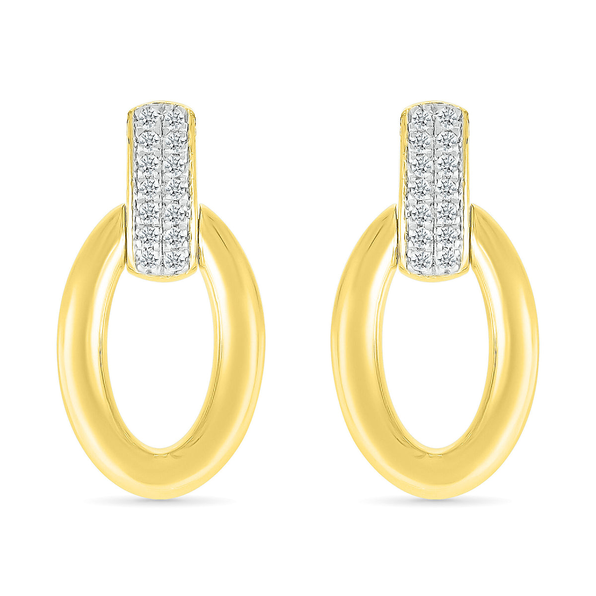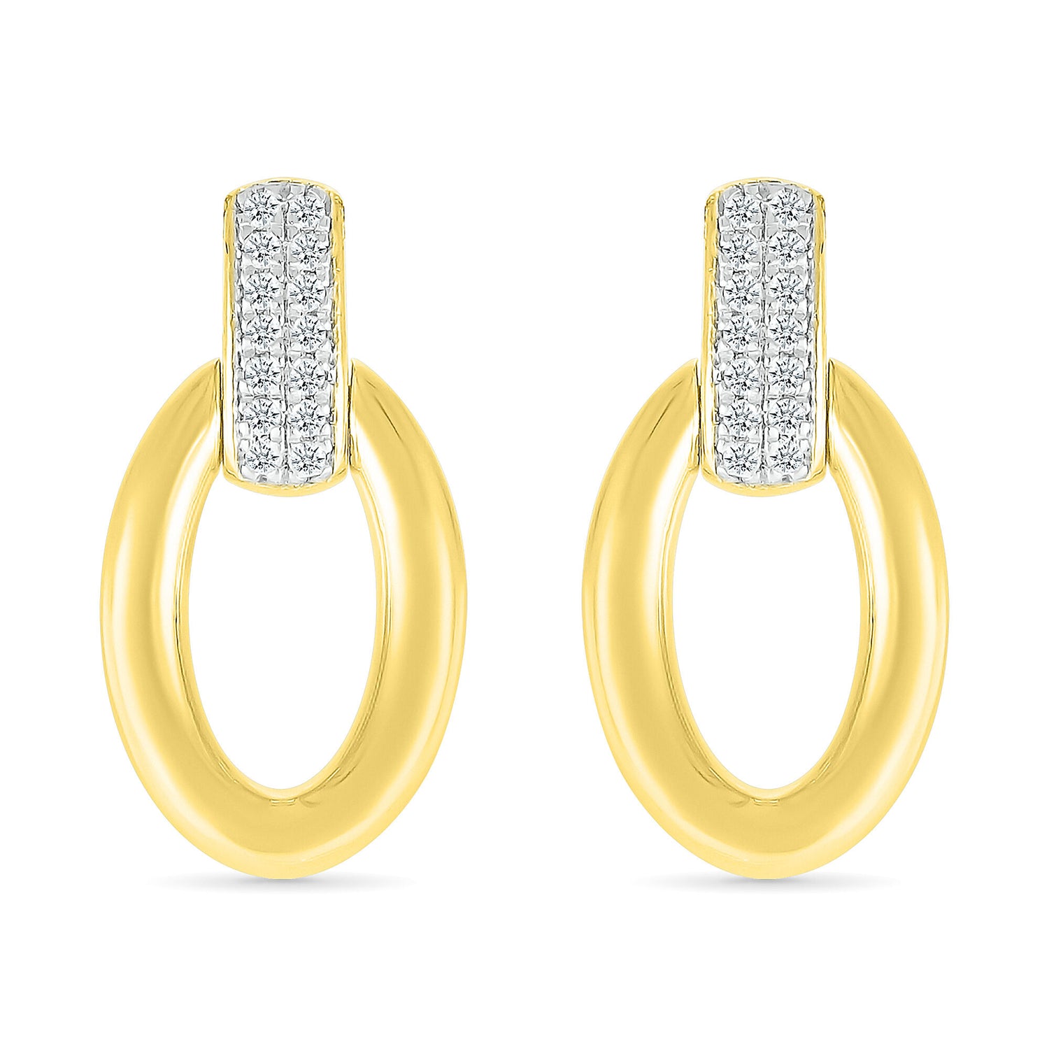 These Diamond Door Knocker Earrings by Helzberg in 10K yellow gold are a stunning statement of luxury. Featuring twenty-eight round single cut diamonds meticulously set in an oval door knocker style, they capture light and attention with every movement.