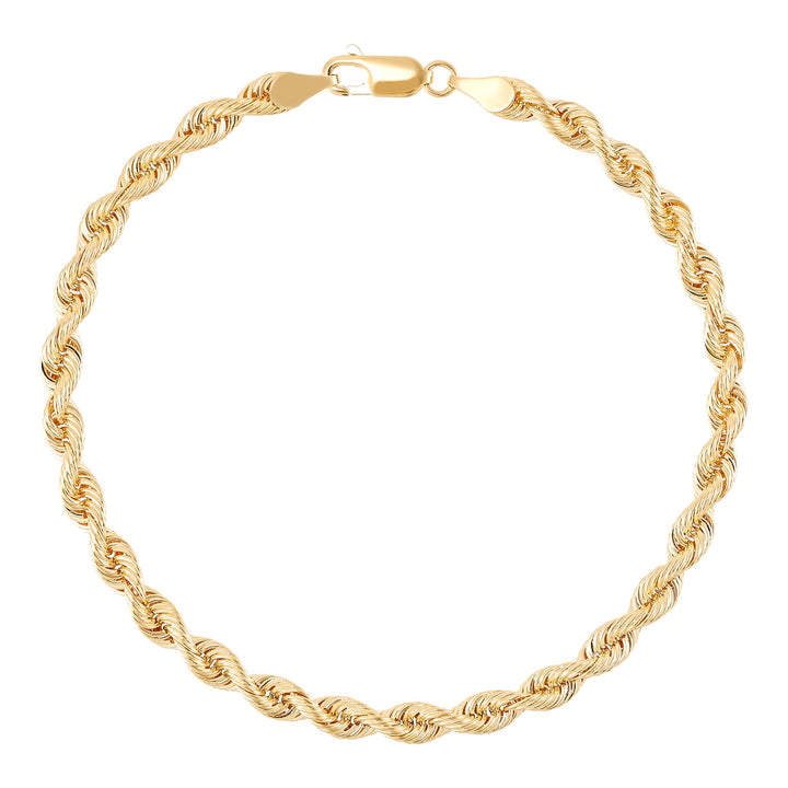 This Solid Silk Rope Bracelet by Helzberg in 14K yellow gold combines luxury and craftsmanship. Measuring 4.3 mm in width and 8.5 inches in length, its intricate rope design shines with a lustrous finish, making it a timeless and versatile accessory.
