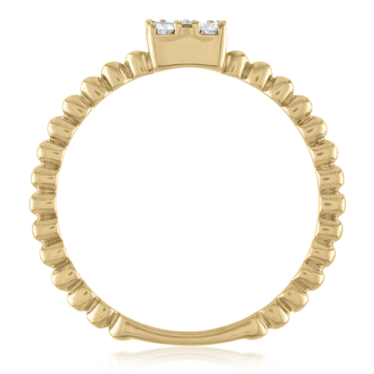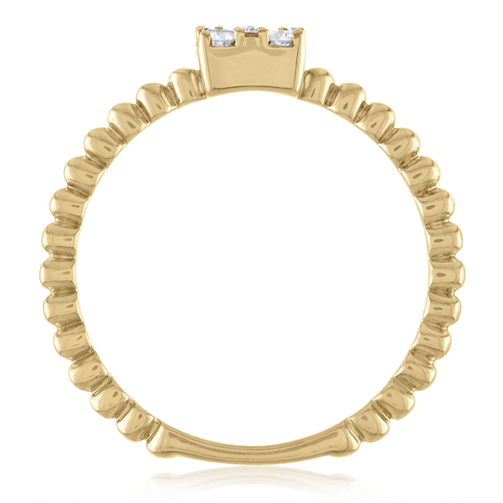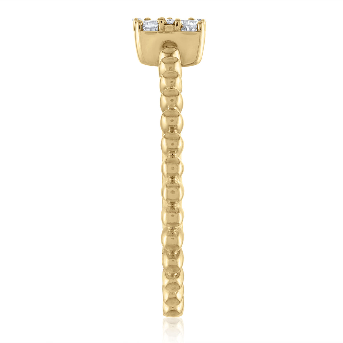 Handcrafted in 10K yellow gold. Features nine round brilliant cut diamonds totaling 1/4 carat total weight. Beaded gold band with square-shaped head.