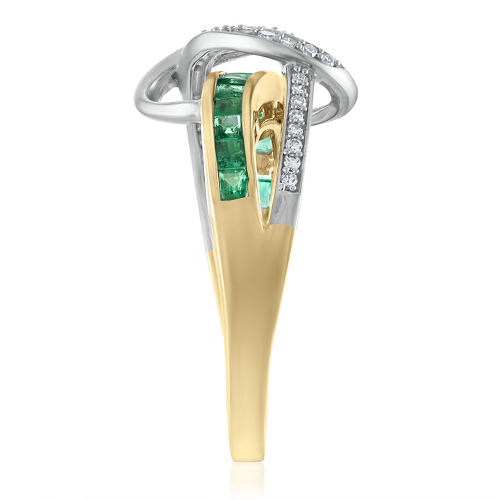 Handcrafted in 14K white and yellow gold. Contains thirteen princess-cut emeralds (~2 mm each) and thirty-eight round single cut diamonds totaling 1/5 carat total weight.