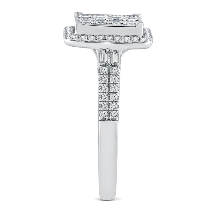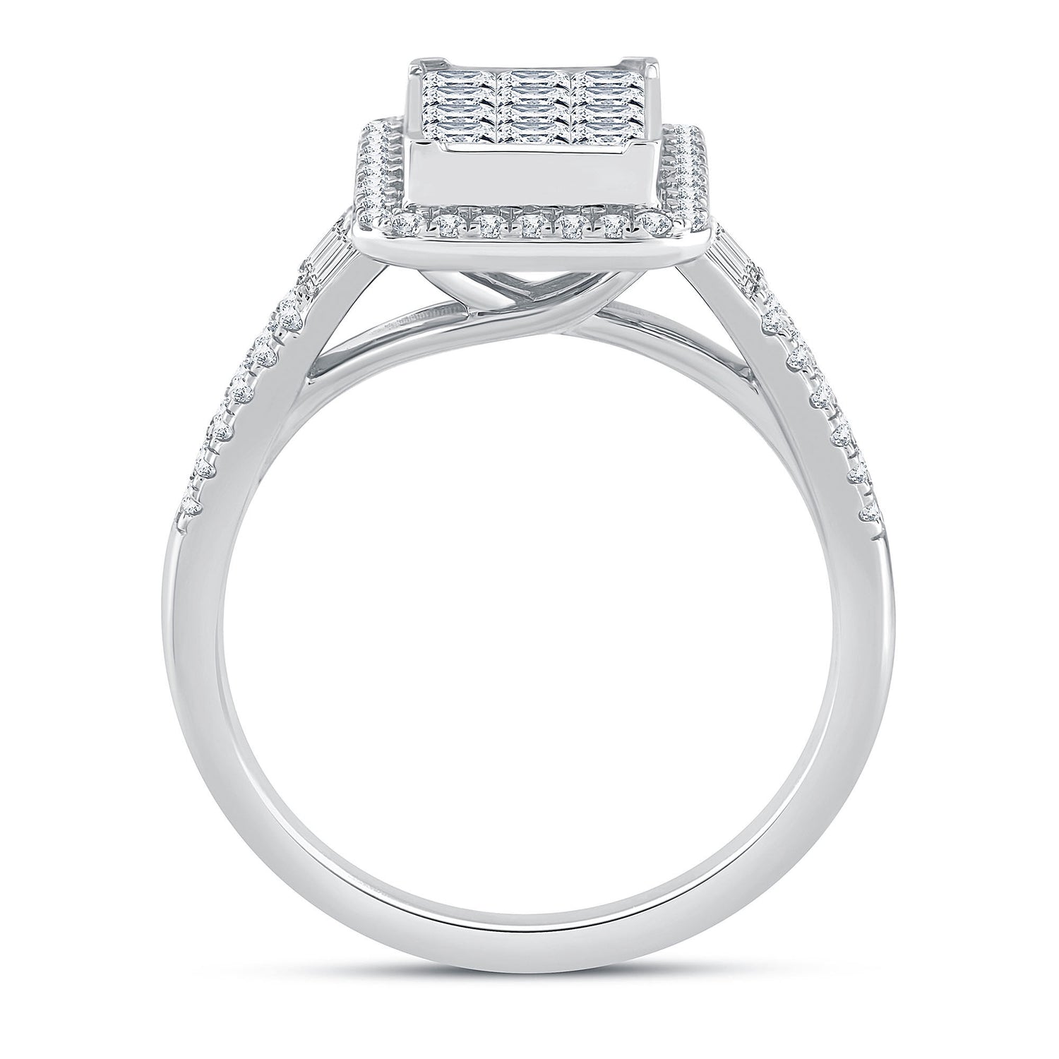 This Emerald-Cut Composite Diamond Engagement Ring by Helzberg in 14K white gold embodies elegance and luxury through its intricate design. The center features a composite of twelve princess-cut diamonds totaling approximately 5/8 carat total weight, complemented by four baguette diamonds and fifty-six round brilliant cut diamonds that shimmer brilliantly. Perfect as a symbol of everlasting love, this ring offers sophisticated brilliance and timeless beauty, destined to be treasured for a lifetime.