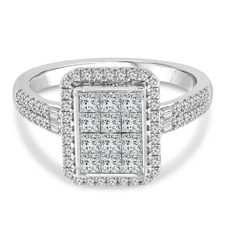 Handcrafted in 14K white gold. Center composed of twelve princess-cut diamonds (~5/8 ct. total weight), four baguette diamonds, and fifty-six round brilliant cut diamonds. Total diamond weight approximately 1 carat.