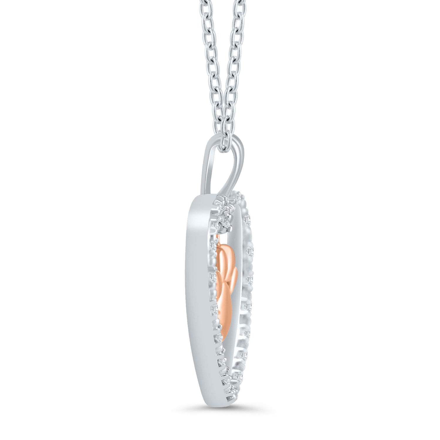 The Diamond Accent Paw Print Heart Pendant by Helzberg combines sterling silver and 10K rose gold in a heartfelt design. Adorned with 21 round single-cut diamonds, it captures elegance and affection, making it a perfect gift for pet lovers and a stylish symbol of love.