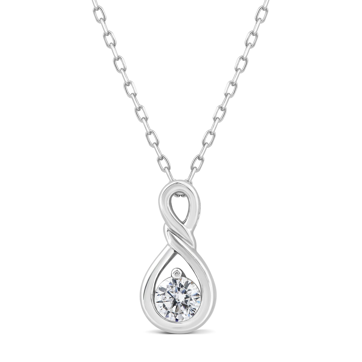 This Lab Grown Diamond Infinity Pendant by Helzberg exudes timeless elegance. Made in 10K white gold, it features a single round brilliant cut lab grown diamond at its center, offering a subtle yet captivating sparkle perfect for any occasion.