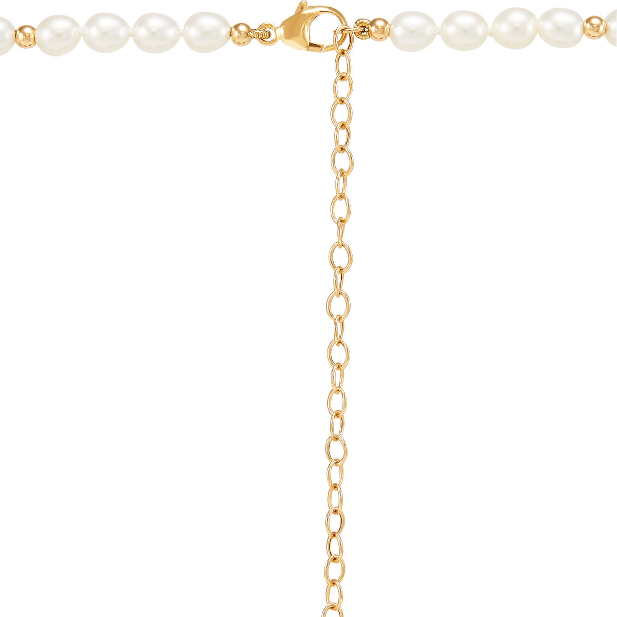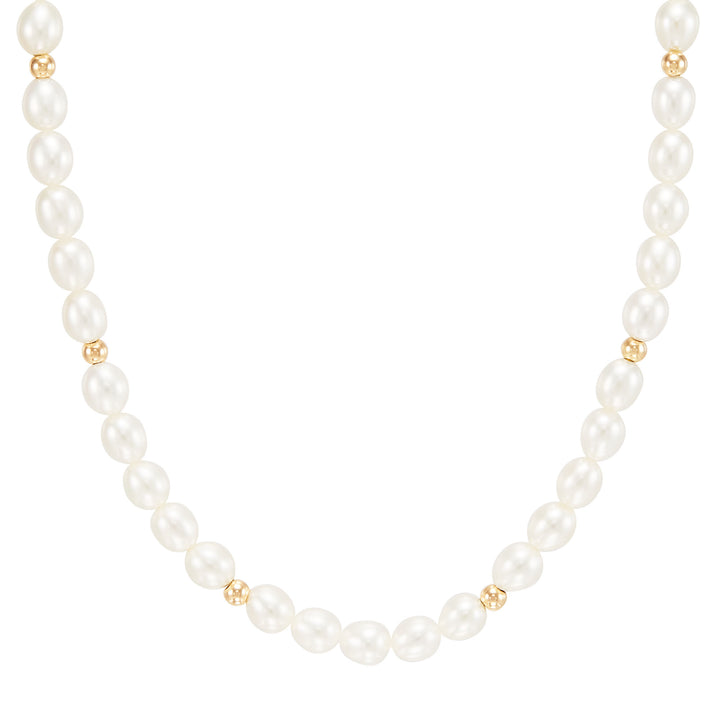 Crafted with 58 oval white cultured freshwater pearls (5-6mm) and 13 14K yellow gold beads strung on a durable strand. Necklace length and clasp type not specified. Polished finish on gold beads.