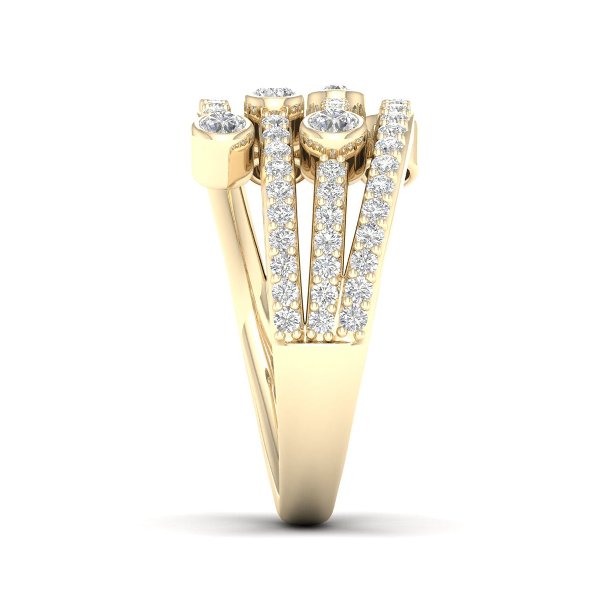 Handcrafted in 10K yellow gold with seventy-six round brilliant cut diamonds totaling approximately 3/4 carat total weight. Comfort fit band design. Exact ring size not specified.
