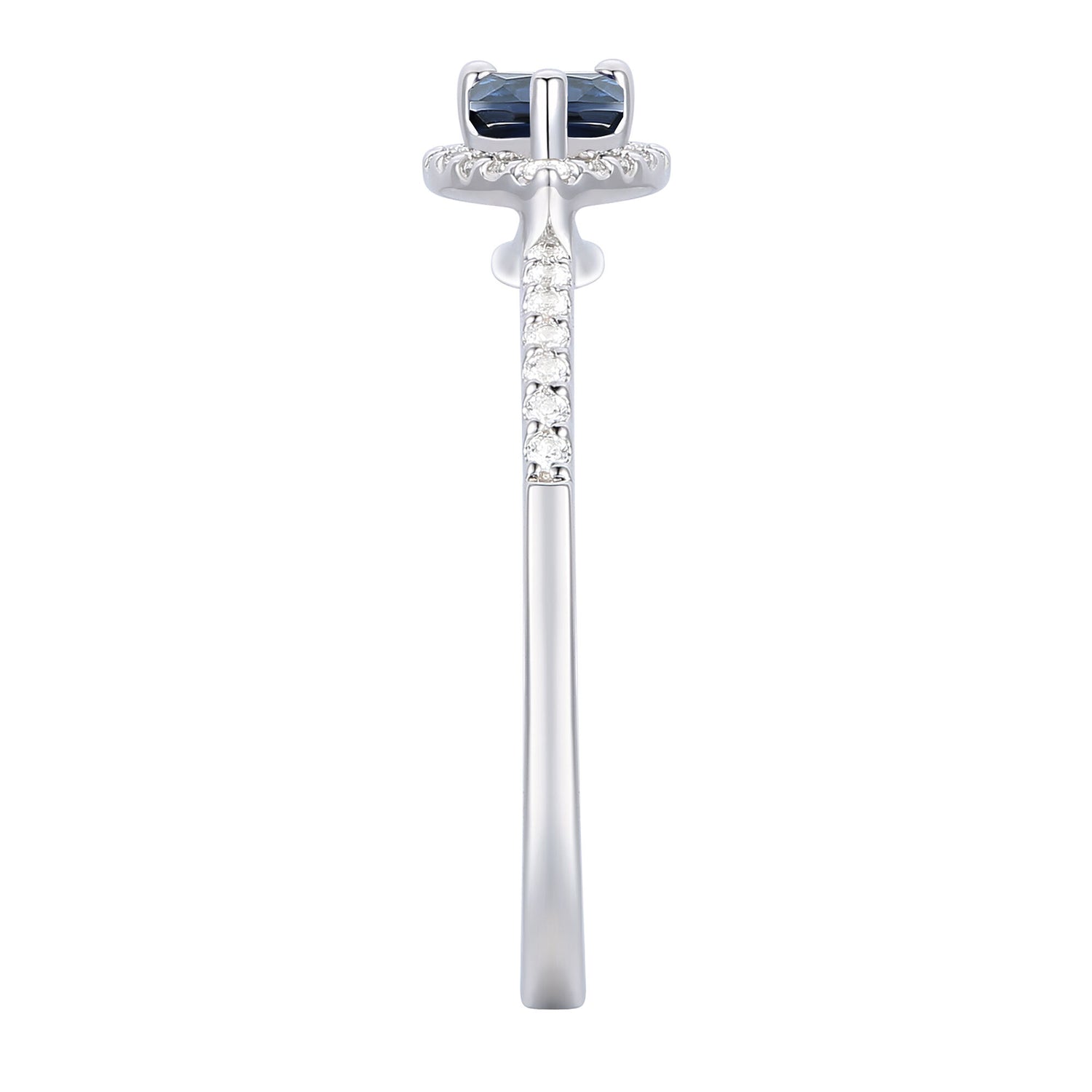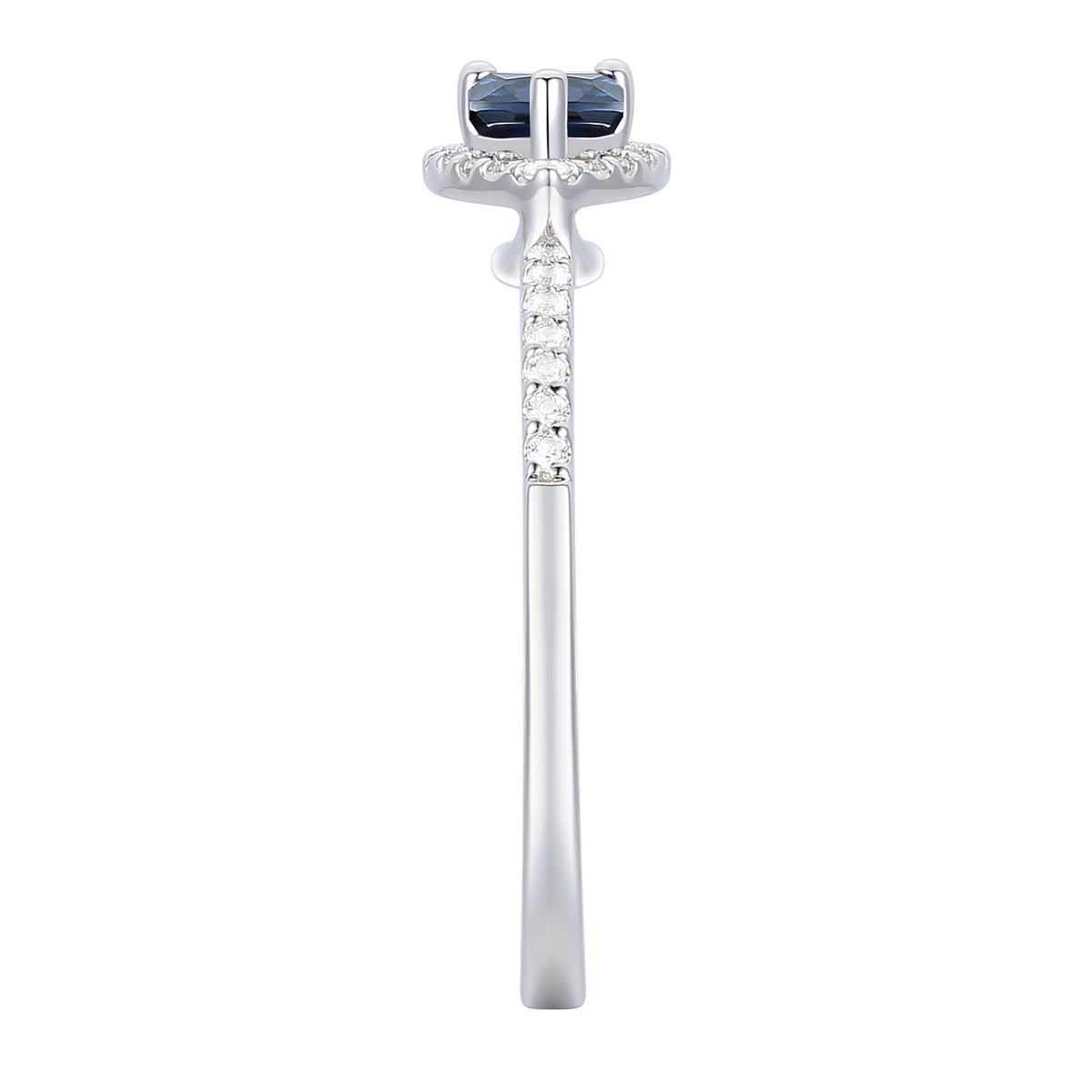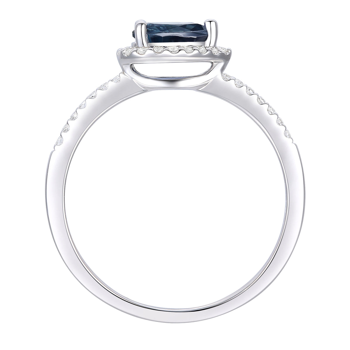 Crafted in 10K white gold, set with one 6x4 mm pear-shaped brilliant blue sapphire (east-west orientation) and 31 round single cut diamonds, total carat weight approx. 1/7 ct. tw., ring size variable.