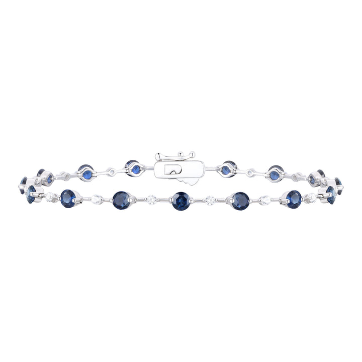 Made in 10K white gold, set with 17 round brilliant cut natural blue sapphires (3 mm) and 17 round brilliant cut diamonds, total carat weight approx. 1/2 ct. tw., bracelet length and clasp standard.