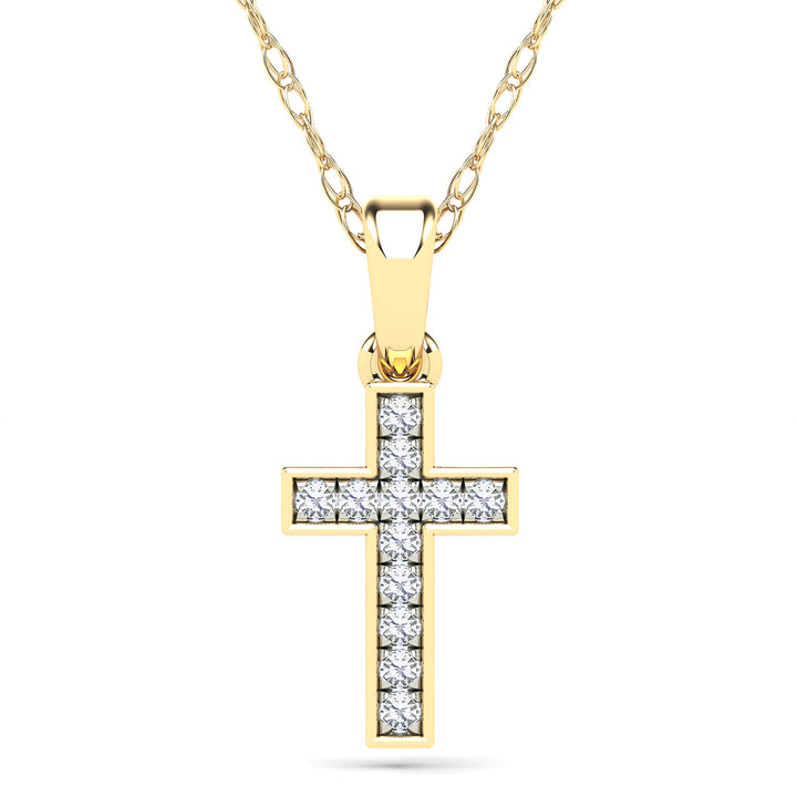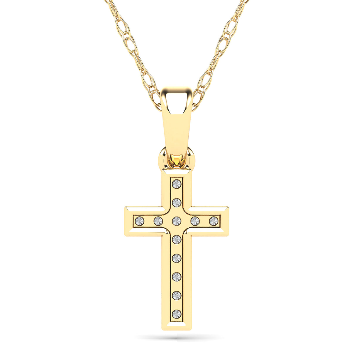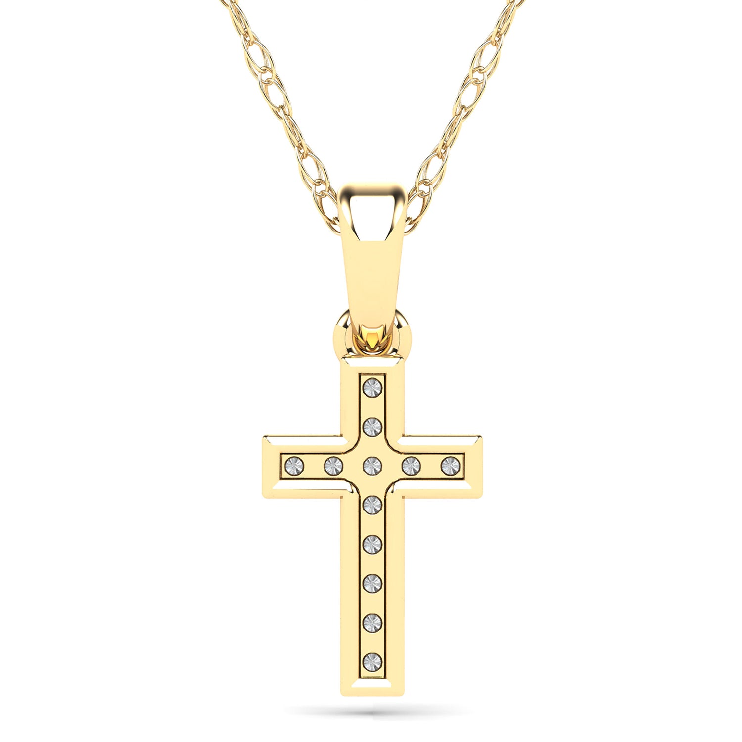 This Diamond Accent Cross Pendant by Helzberg is a meaningful expression of faith and beauty. Crafted in 14K yellow gold, the pendant features 20 round single cut diamonds forming a traditional cross design, delivering a subtle yet radiant sparkle. This piece blends spirituality with elegant craftsmanship, perfect for daily wear or special moments that call for a symbol of hope and devotion.