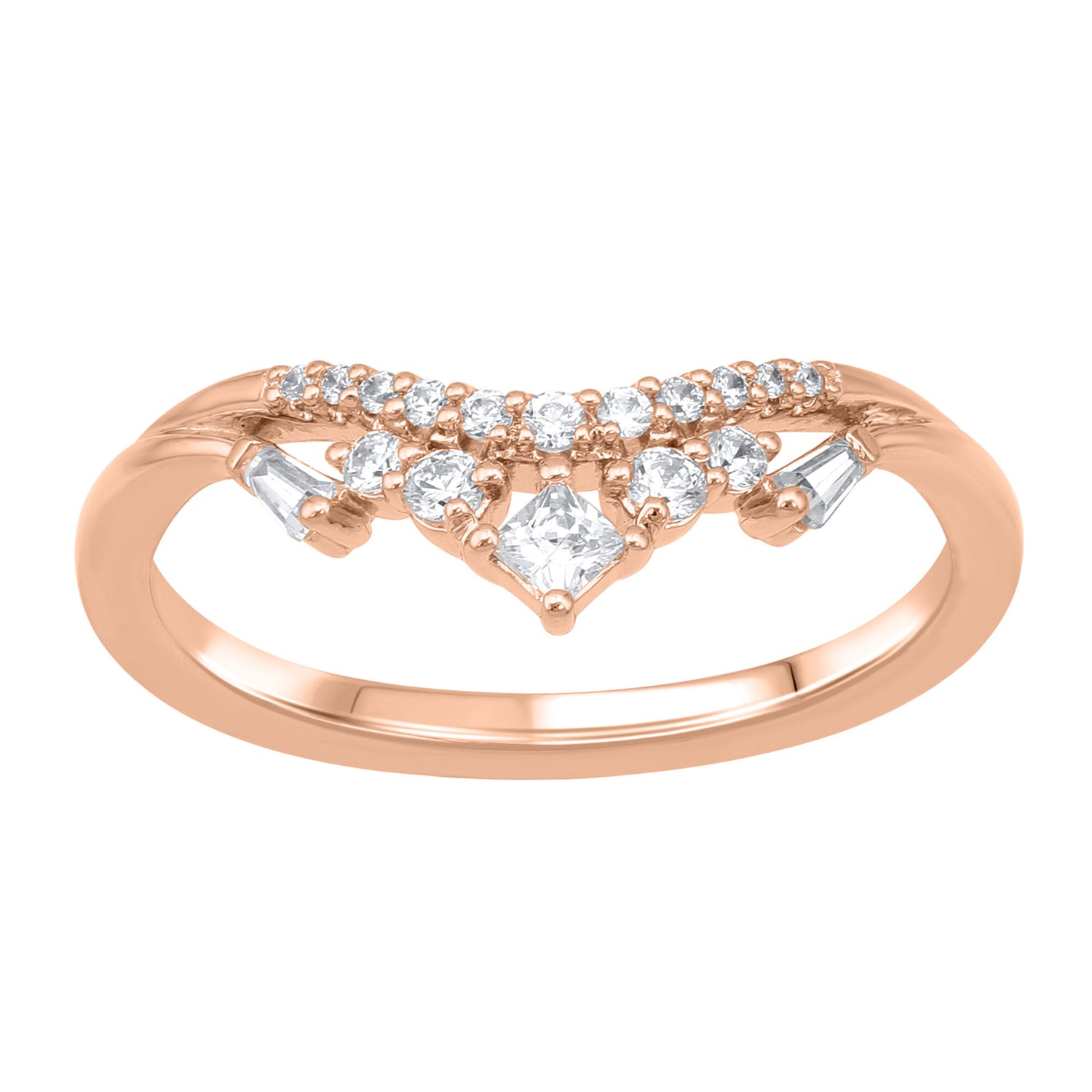 Crafted in 14K rose gold. Set with 1 princess cut, 2 baguette cut, and 15 round brilliant cut diamonds totaling approximately 0.25 carats. Contour band with polished finish and comfort fit.