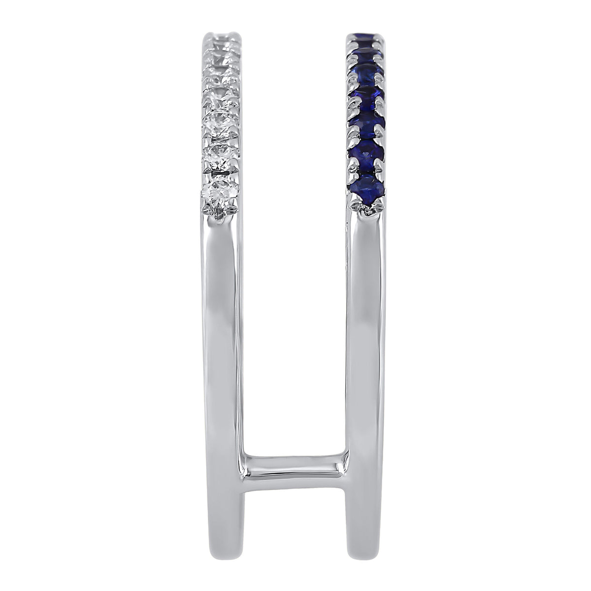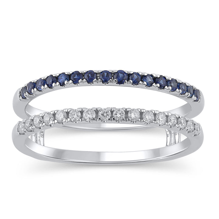 This Diamond and Blue Sapphire Enhancer by Helzberg is a captivating piece in 10K white gold, featuring 16 round brilliant cut diamonds and 16 mesmerizing blue sapphires measuring 1.5mm each. Designed to add a dance of light and color, it is a magical accessory for any ring stack.
