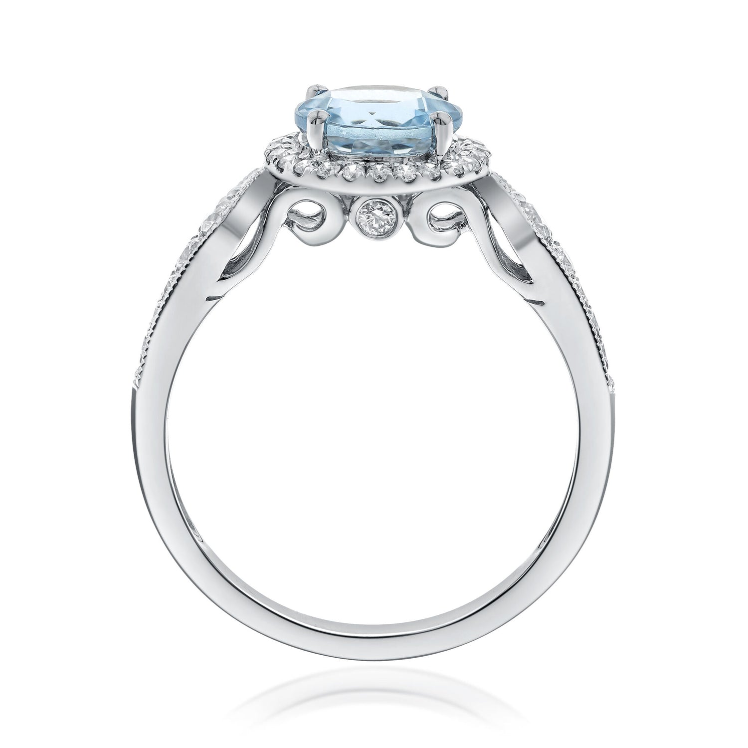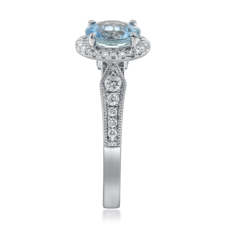 Crafted in 10K white gold. Set with one oval aquamarine (size not specified) and 40 round brilliant cut diamonds totaling approximately 0.33 carats. Polished finish.
