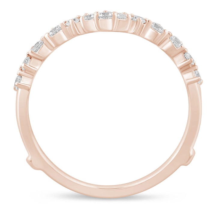 This Diamond Chevron Insert by Helzberg offers a sophisticated twist to your jewelry collection. Crafted in 14K rose gold, the insert features a dazzling chevron pattern of 13 round brilliant cut diamonds on one side paired with a smooth polished band on the other. It is a versatile piece designed to add sparkle and elegance, perfect for enhancing your engagement ring or stacking styles.