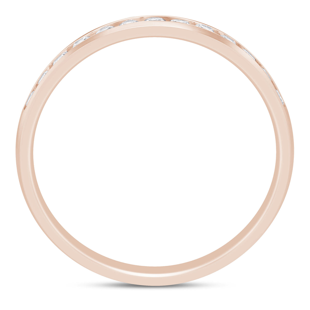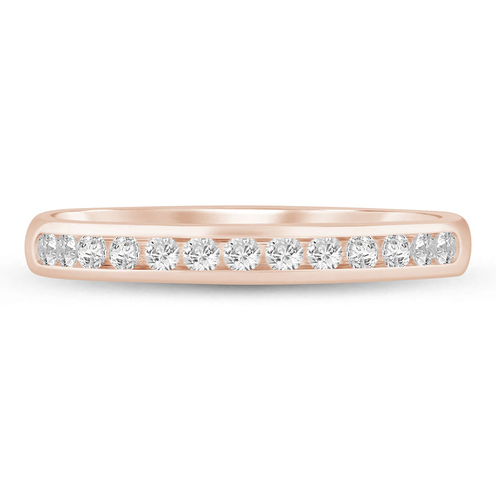 Crafted in 14K rose gold, set with 13 round brilliant cut diamonds totaling 1/4 carat total weight. Classic channel band style with standard sizing.