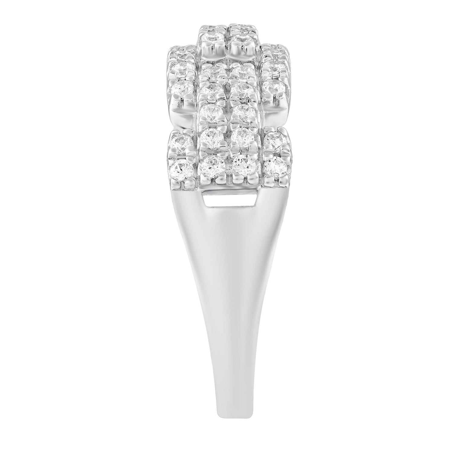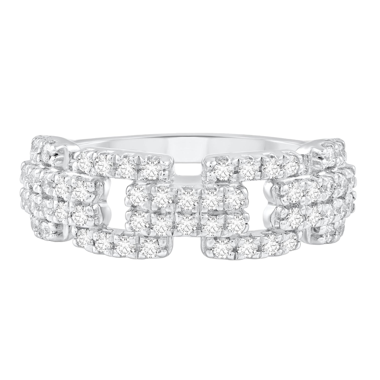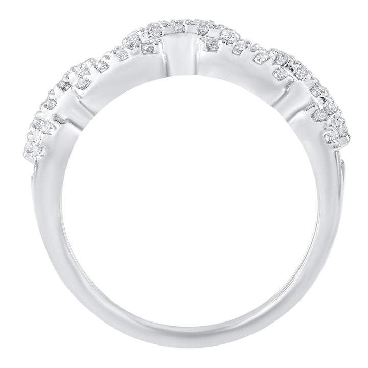 Handcrafted in 10K white gold, featuring 54 round brilliant cut diamonds with a total weight of 1/2 carat. Includes standard ring sizing and durable setting.