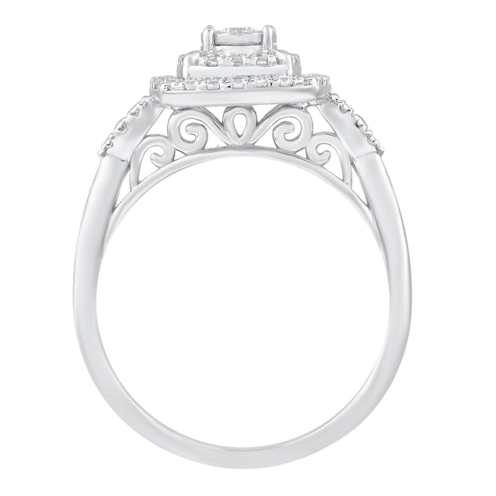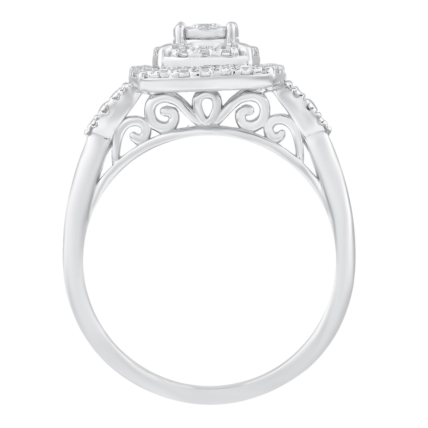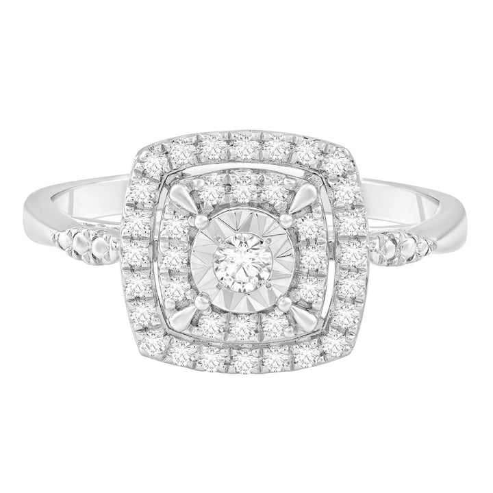 This Cushion Diamond Ring by Helzberg is a refined display of elegance. Crafted in 10K white gold, it features 37 round brilliant cut diamonds totaling approximately 1/4 carat, arranged in a cushion design that adds depth and radiance. Perfect for celebrating special moments with subtle sparkle.