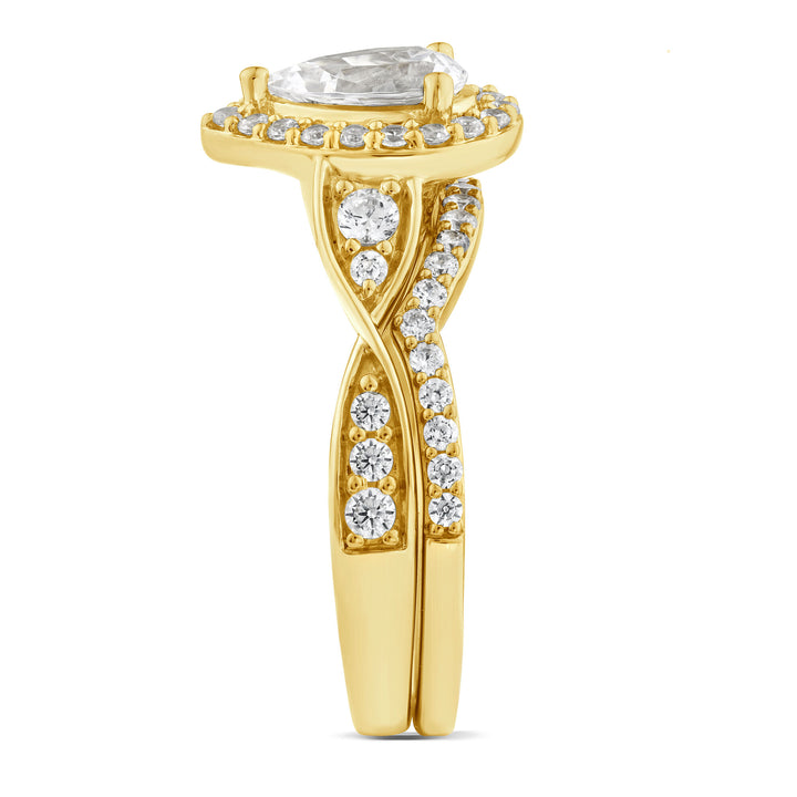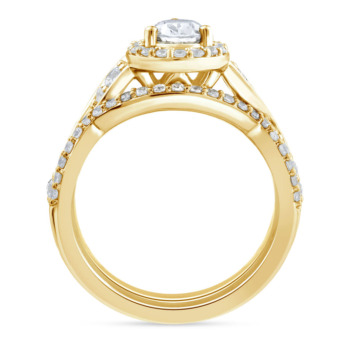 Crafted in 10K yellow gold, featuring a 3/4 carat pear brilliant cut lab grown diamond center stone (GCAL certified), accented by 51 round brilliant cut lab grown diamonds totaling approximately 1 1/3 carat weight.
