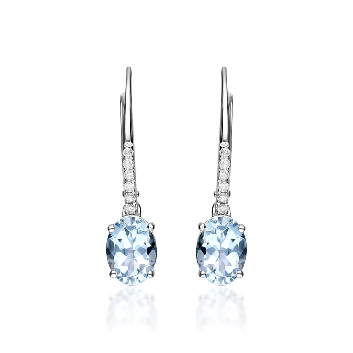 These Aquamarine and Diamond Accent Drop Earrings by Helzberg exude graceful sophistication and sparkle. Crafted in 10K white gold, they showcase two oval brilliant cut natural aquamarine stones, each measuring 7MM x 5MM. Accented with 12 round brilliant cut diamonds, these earrings catch the light with every movement, perfect for elevating evening wear or adding refined glamour to everyday looks.