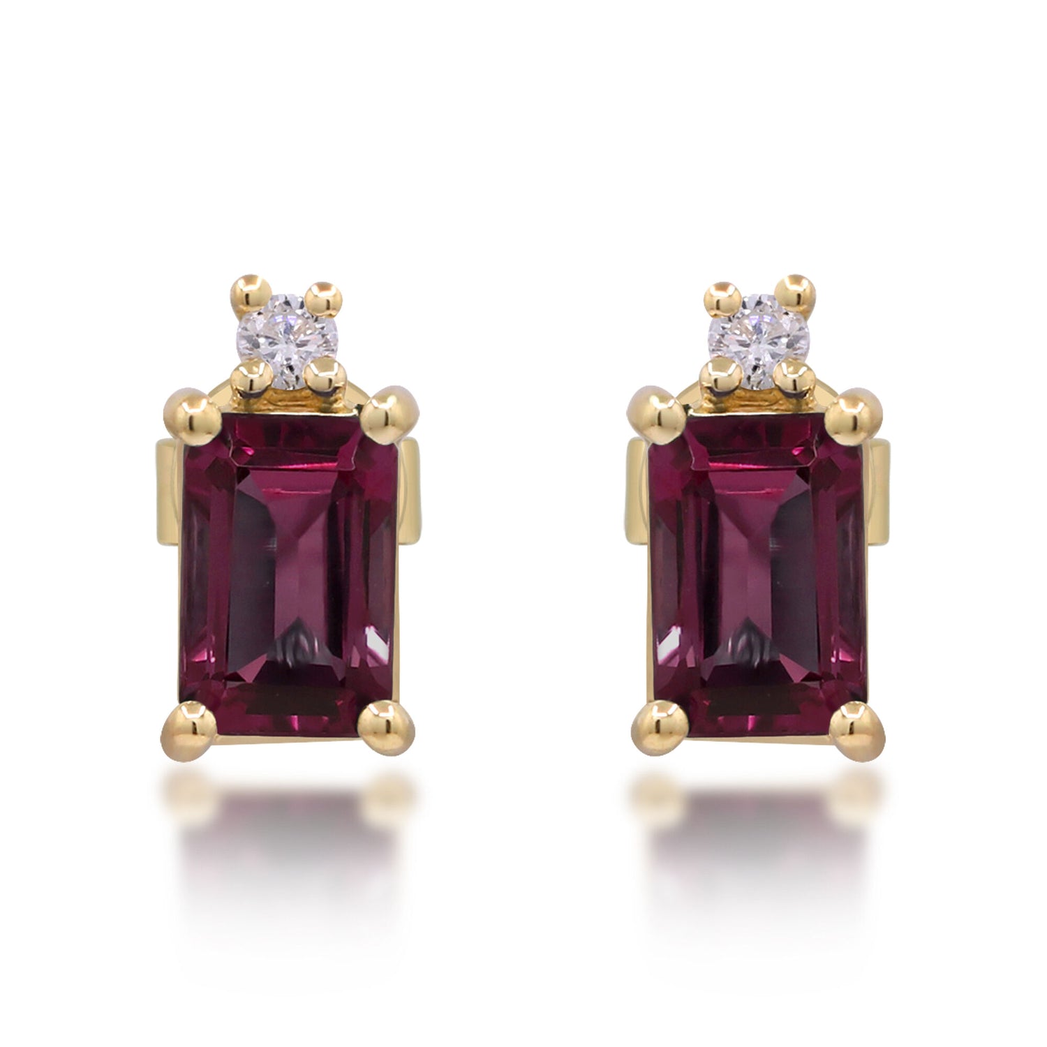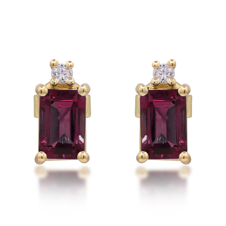 Handcrafted in 10K yellow gold with one 6x4 mm emerald-cut garnet and one round diamond per earring. Earring dimensions available on request.